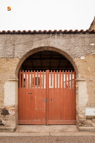 ubicato nel centro di San Gavino Monreale, il bene è uno dei portali storici del paese. Si tratta di un portale ligneo a doppia anta a protezione di un'apertura ad arco a tutto sesto interamente in #ladiri#. Il paramento murario ed i piedritti sono parzialmente intonacati. La struttura è coperta da una falda inclinata sorretta da muratura in #ladiri#, ed il colmo è protetto da tegole portoghesi. Il portale ha una struttura a battenti ad altezza d'uomo a doghe verticali semiaccostate ad aria passante nella parte superiore e chiusa in quella inferiore, montate su un telaio interno e presenta superfici delle assi trattate con vernice arancione. Il portale ha affaccio diretto su strada per un'altezza di 3,20 metri per 2,46 di larghezza.