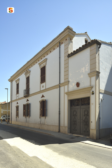 edificio a corte interna con sviluppo planimetrico a C. L'edificio residenziale ha pianta pressocchè rettangolare simmetrica e compatta, costruita su due livelli fuori terra e copertura a padiglione con manto di tegole curve di fattura artigianale. L'involucro murario è in blocchi di làdiri (fango e paglia) costruito su di un basamento in pietra; pilastri in mattoncini pieni allettati con malta di calce. I solai sono costituiti da un'orditura lignea di travi e tavolato. Il prospetto principale si affaccia sulla via Roma con un'altezza di oltre 8 metri e per una lunghezza di oltre 27. Addossato ai prospetti interni è il classico loggiato ad archi (sa lòlla) che percorre tutto il perimetro interno della struttura, circondando la corte; è ad un livello fuori terra ed è coperto da un manto di tegole curve artigianali. Continua in Oss.