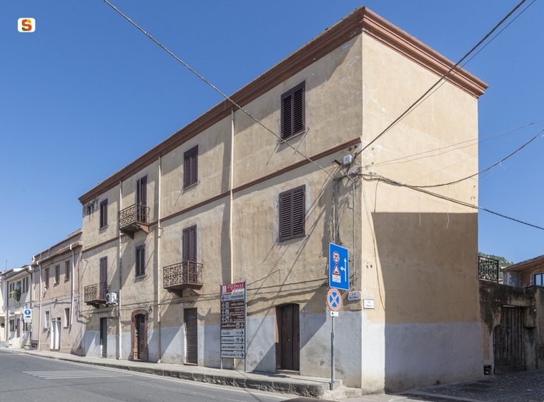 risalente ai primi del Novecento, l’edificio, in muratura portante e copertura a padiglione, originariamente di due piani, è stato successivamente elevato di un ulteriore piano oltre la linea marcapiano. SI affaccia sulla SS 129, Trasversale Sarda, occupando una superficie di circa 120 mq di un lotto, per il resto occupato da cortile sul quale si affacciano bassi manufatti. Il fronte principale risulta ordinato ed equilibrato, unici elementi sottolineati sono: il portale di ingresso principale, con crossa e lineare cornice in trachite e arco fortemente ribassato; i tre balconi, due al primo e uno al secondo piano in asse col portone, costituiti da due mensole lapidee che sorreggono un piano dello stesso materiale, protetti da parapetto in ferro battuto.