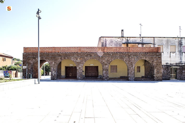 l'edificio, è costituito da un corpo ad un unico livello, di dimensioni stimate 8 x 28 m., a cui si accompagna un secondo a due piani, di dimensioni stimate 10 x 40 m., indipendente e disposto ad angolo retto rispetto al primo, entrambi dotati di una copertura a doppia falda. I due corpi risultano raccordati tra loro da uno spazio porticato, dimensioni stimate 3 x 23 m., con arcate a tutto sesto realizzate in muratura a vista con paramento bugnato in trachite rossa, materiale locale ampiamente impiegato nella edificazione di Carbonia, sulla quale poggiano i terrazzi piani ed accessibili dai locali posti al piano primo degli edifici. I fronti risultano impaginati da una ordinata scansione di aperture rettangolari, su un paramento continuo in muratura intonacata. A coronamento dei terrazzi posti a copertura degli spazi porticati caratterizzati dalle arcate a tutto sesto in trachite bugnata, un delicato parapetto in laterizio traforato, caratterizza i prospetti.