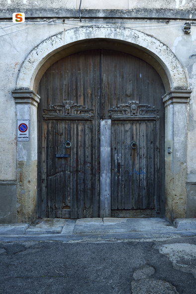 portale ligneo a doppia anta inscritto in un arco policentrico. L'imbotte è costituito da un doppio paramento di mattoncini pieni intonacati costruiti su due squadrati monoliti basali. Il portale ha una struttura a doghe accostate, montate su un telaio interno; presenta superfici lisce da cui risaltano due cornici di doghe che circoscrivono i bordi di un doppio ingresso pedonale rettangolare. Decorative modanature in rilievo sono presenti in corrispondenza degli ingressi. Il portale si affaccia su strada con 3,80 metri di altezza per 3 di larghezza. Continua in OSS.