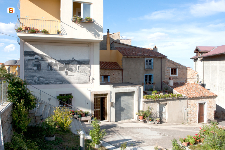 Sa Serra. veduta di Fonni e figura femminile con bambino