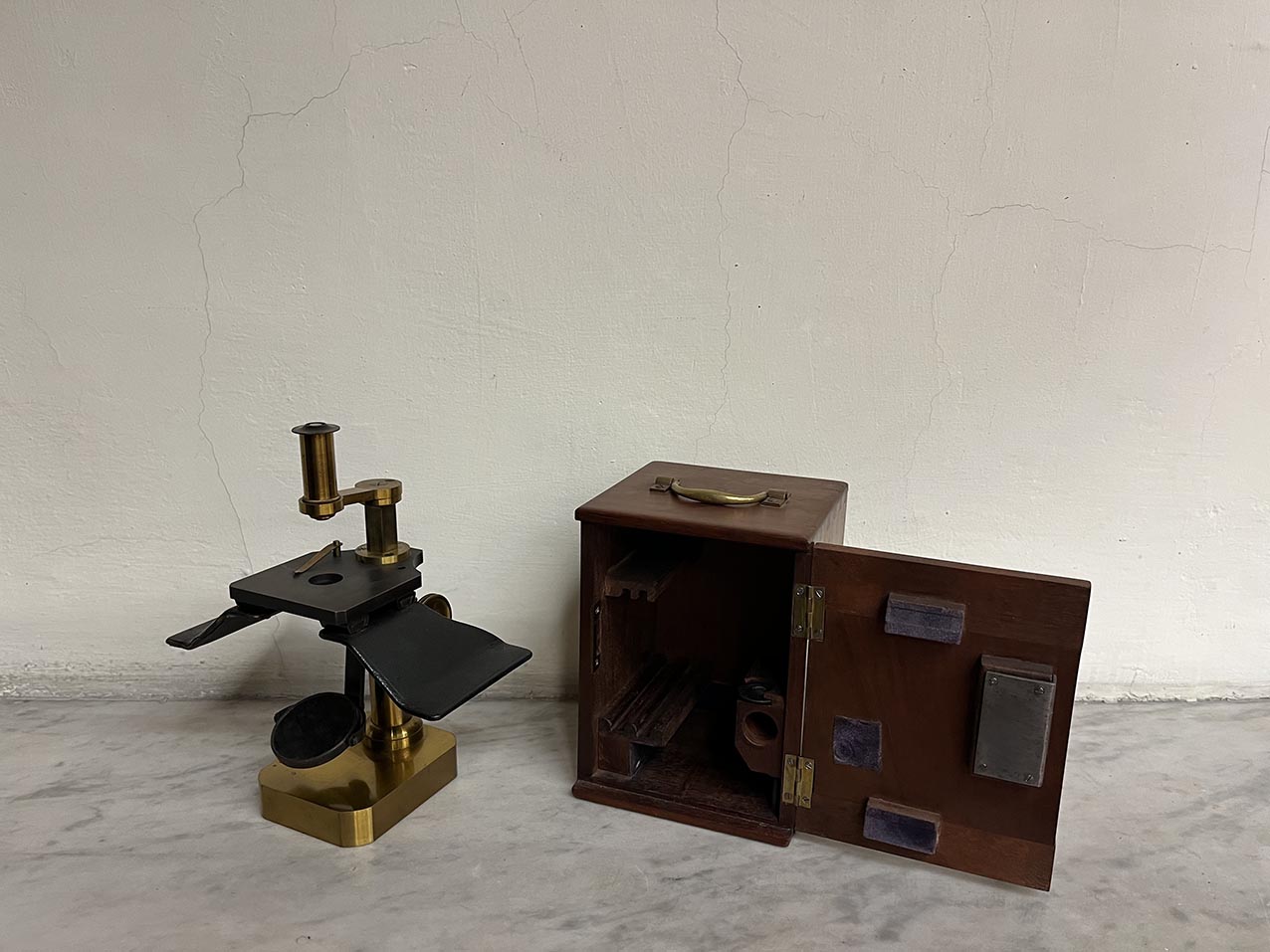 Il microscopio, tedesco, è firmato sulla base "224 2377 C. Zeiss Jena" ed è in ottone eccetto: tavolino, poggiamani, braccio porta specchio. Il tubo porta ottica si incastra nell'anello di un braccio porta tubo fissato sulla sommità di una colonna a sezione quadrata (lunga 8,5 cm). La regolazione della messa a fuoco avviene mediante due manopole zigrinate che agiscono su un sistema a cremagliera e pignone posto sul retro di una seconda colonna a sezione circolare situata al di sotto del tavolino. Ha due lenti: con una singola lente funge da microscopio semplice, con gruppo ottico funge da microscopio composto. Il tavolino porta oggetti, sul quale vi è una molletta per fermare i vetrini, possiede una coppia di poggiamani di metallo estraibili che si inseriscono con slitte a coda di rondine; al di sotto vi è lo specchio con una superfici e concava e una opaca, questo è portato da un braccio molto articolato. Il tubo ha un obiettivo a bottone avvitato ad una estremità