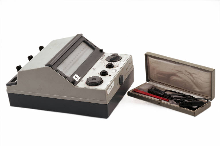 Lo strumento ha base rettangolare e forma vagamente trapezoidale. Poggia su quattro piedini in gomma e metallo e il quadrante di lettura è inclinato per facilitarne la visione.||Nella parte anteriore del pannello frontale sono inseriti un potenziometro per la regolazione del punto zero, due interruttori e un commutatore, collegato allo strumento di misura vero e proprio a bobina mobile posto all'interno della custodia, per selezionare i campi di misura da 5x10exp-6 a 5x10exp-3 Weber/Skt .||La scala di lettura lineare permette misure da 30 a sinistra di zero a 120 a destra di zero, con indicazioni numeriche ogni 10 e tacche ogni unità.||La scala è tarata direttamente in unità di flusso magnetico.||La scala è stampata su un vetro trasparente estraibile (probabilmente erano disponibili diverse scale a seconda del fondo scala) con indice di lettura luminoso generato da una lampada posta all'interno dell'apparecchio. ||Nella parete verticale anteriore è presente un foro in cui è inserita la lampadina posta di fronte ad uno specchietto solidale all'equipaggio mobile.||Nella parte posteriore del pannello frontale sono inserite le boccole per il collegamento della sonda e la messa a terra, più una presa per il collegamento della lampadina 4V/0,75A.||Lateralmente è inserita una rotella per la regolazione dell'intensità luminosa.||A parte, in una custodia rigida, è conservata la sonda per campi elettromagnetici