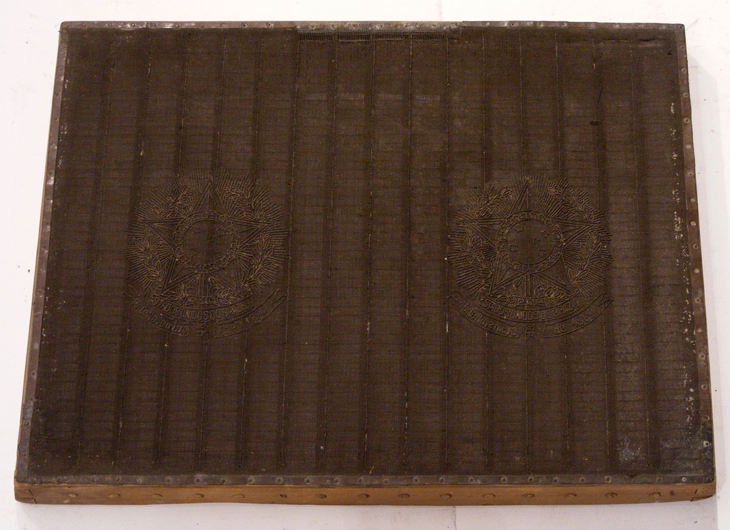 - NOTIZIE STORICO CRITICHE La “forma da carta” in oggetto, caratterizzata da una filigrana in chiaro su ogni metà del foglio, con due blasoni con stella centrale a 5 punte e internamente 5 stelle e in basso la scritta su doppio cartiglio: STADOS UNIDOS DO BRAZIL/ 15 de Novembro de 1889, serviva per la produzione di carta destinata allo Stato del Brasile. I rapporti commerciali dei Magnani con il Sud America sono frequenti sin dai primi anni dell’attività delle cartiere, agli inizi dell’Ottocento