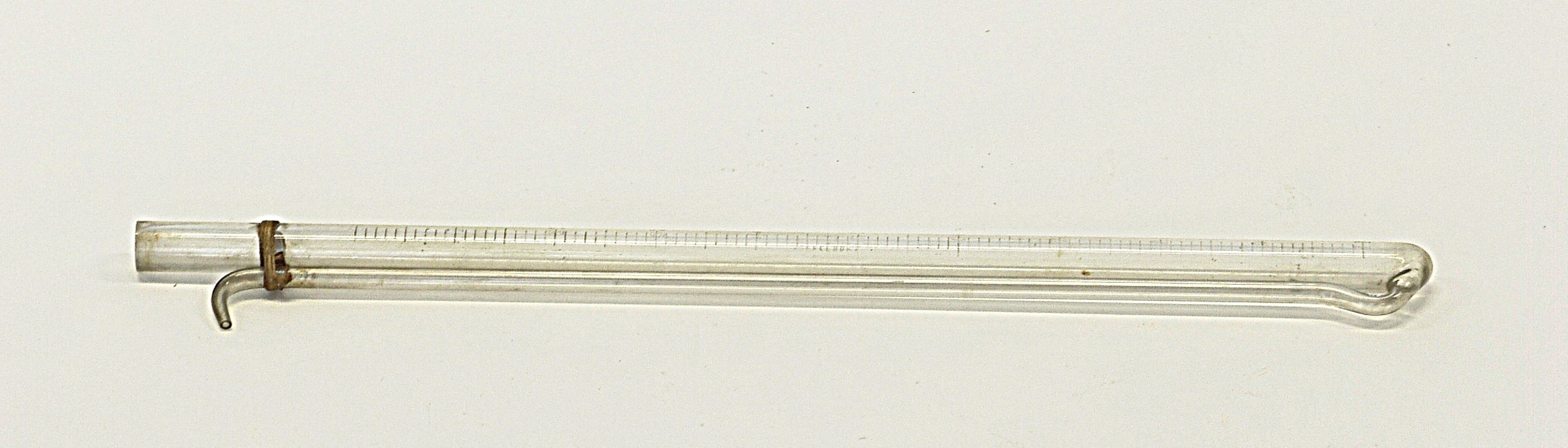 La buretta ha un corpo cilindrico a fondo arrotondato, senza piedistallo, e un cannello che ne segue il profilo. Scala 0-10, incisa a mano