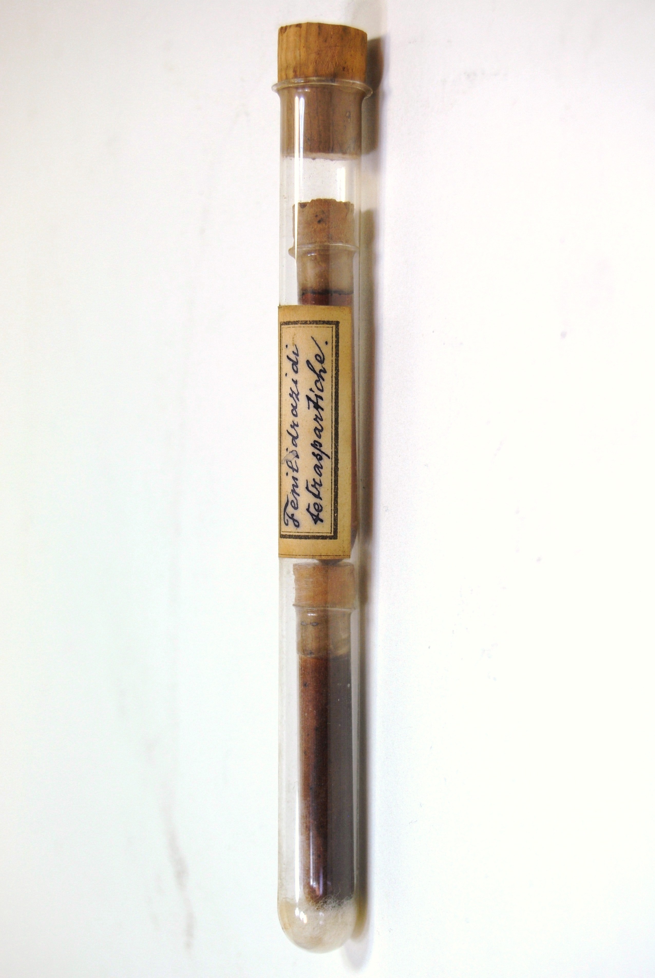Provetta in vetro con tappo in sughero con all'interno altre due provette più piccole con tappo in sughero (la prima provetta è adagiata su cotone) contenenti prodotti chimici allo stato solido di colore rispettivamente arancione e marrone