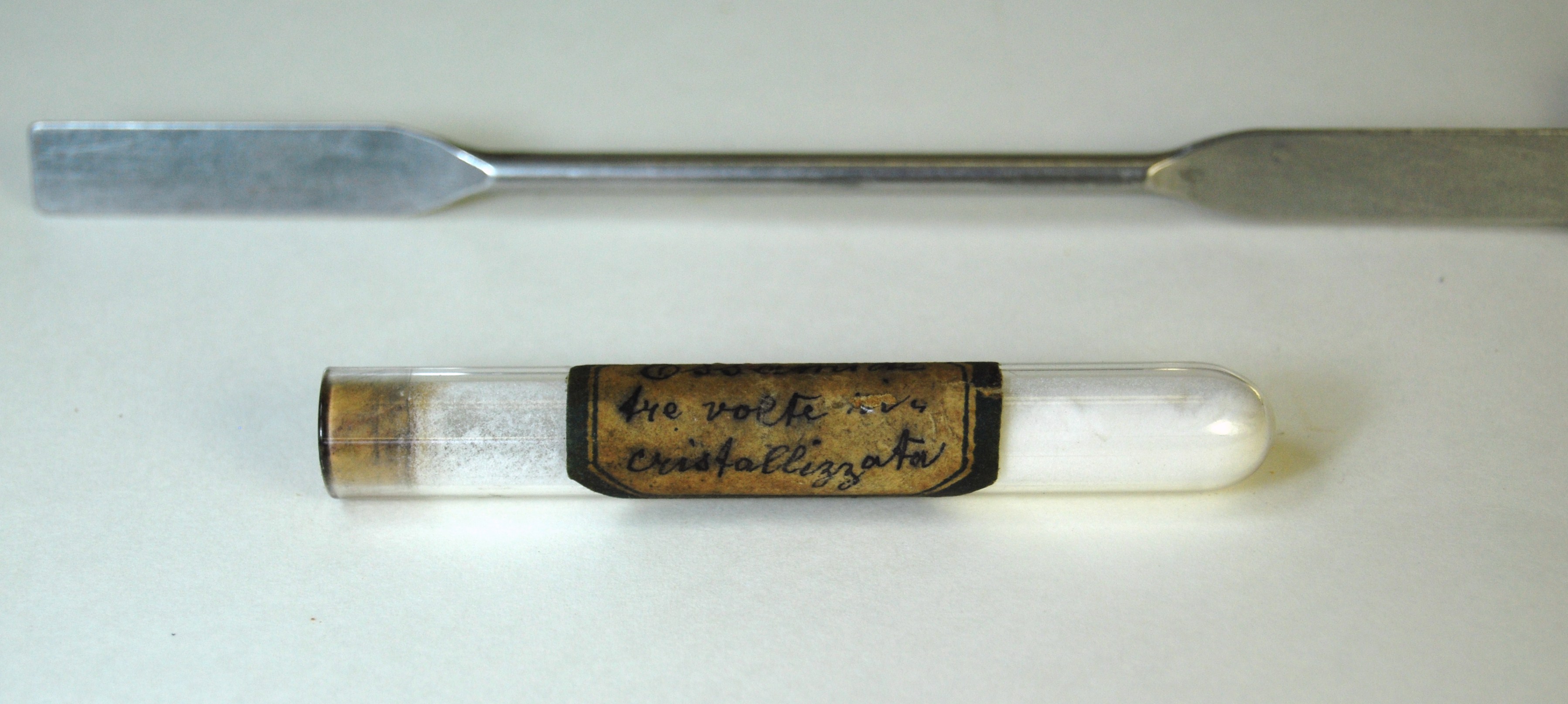 Provetta in vetro con tappo in sughero con all'interno prodotto chimico allo stato solido, sotto forma di polvere di colore bianco