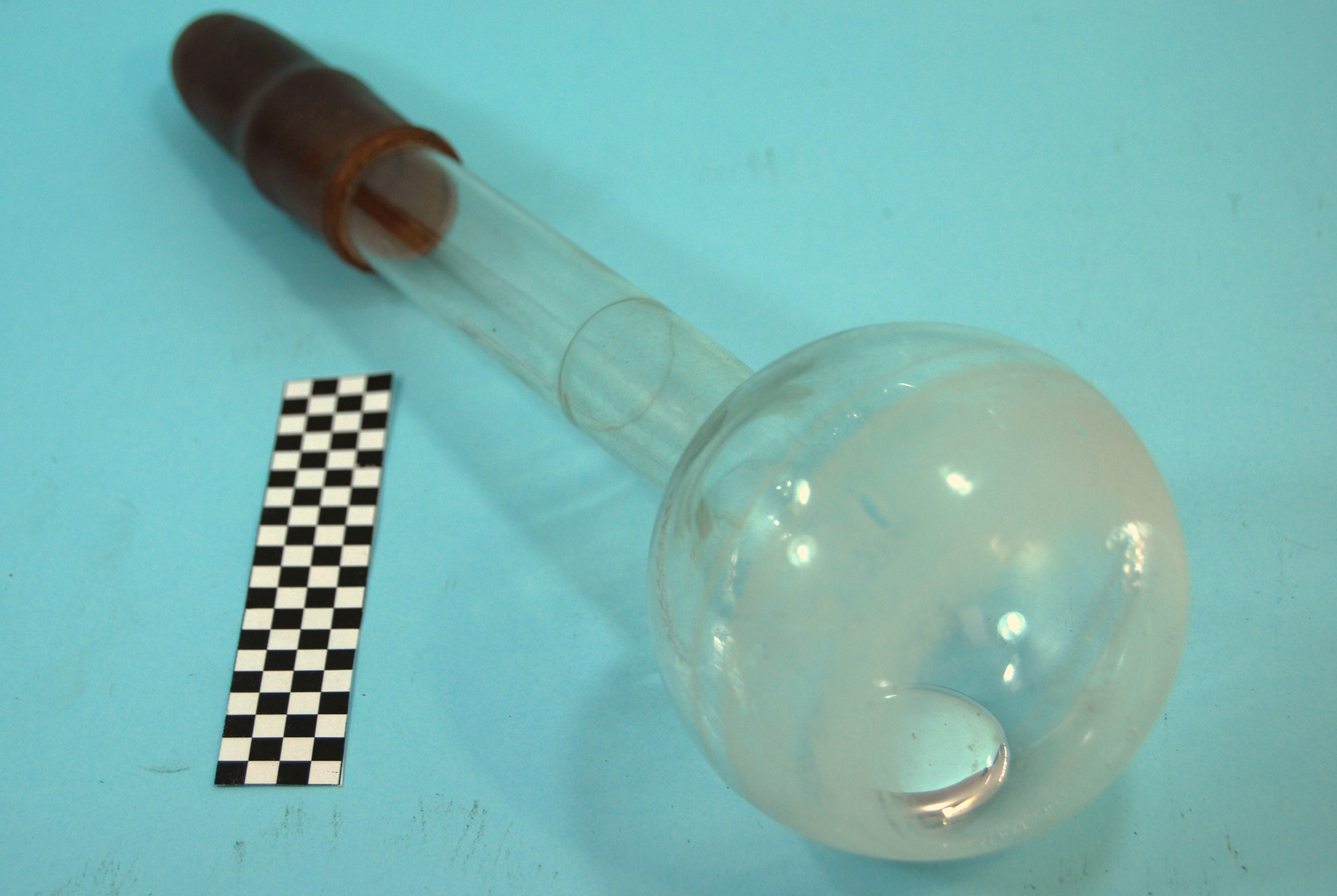 Sfera in vetro per l' "attivazione dell'acqua" secondo la teoria di Piccardi, contenente gas Argon a bassa pressione e mercurio, con bulbo in vetro