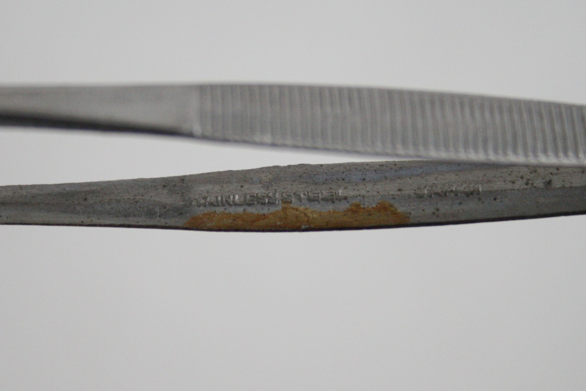 strumento chirurgico in unico pezzo; scanalatura all'altezza dell'impugnatura su entrambi i lati; punte scanalate internamente: forse in astuccio con bisturi per dissezione (num. inv. 3586) e spatola per dissezione (num. inv. 3587)