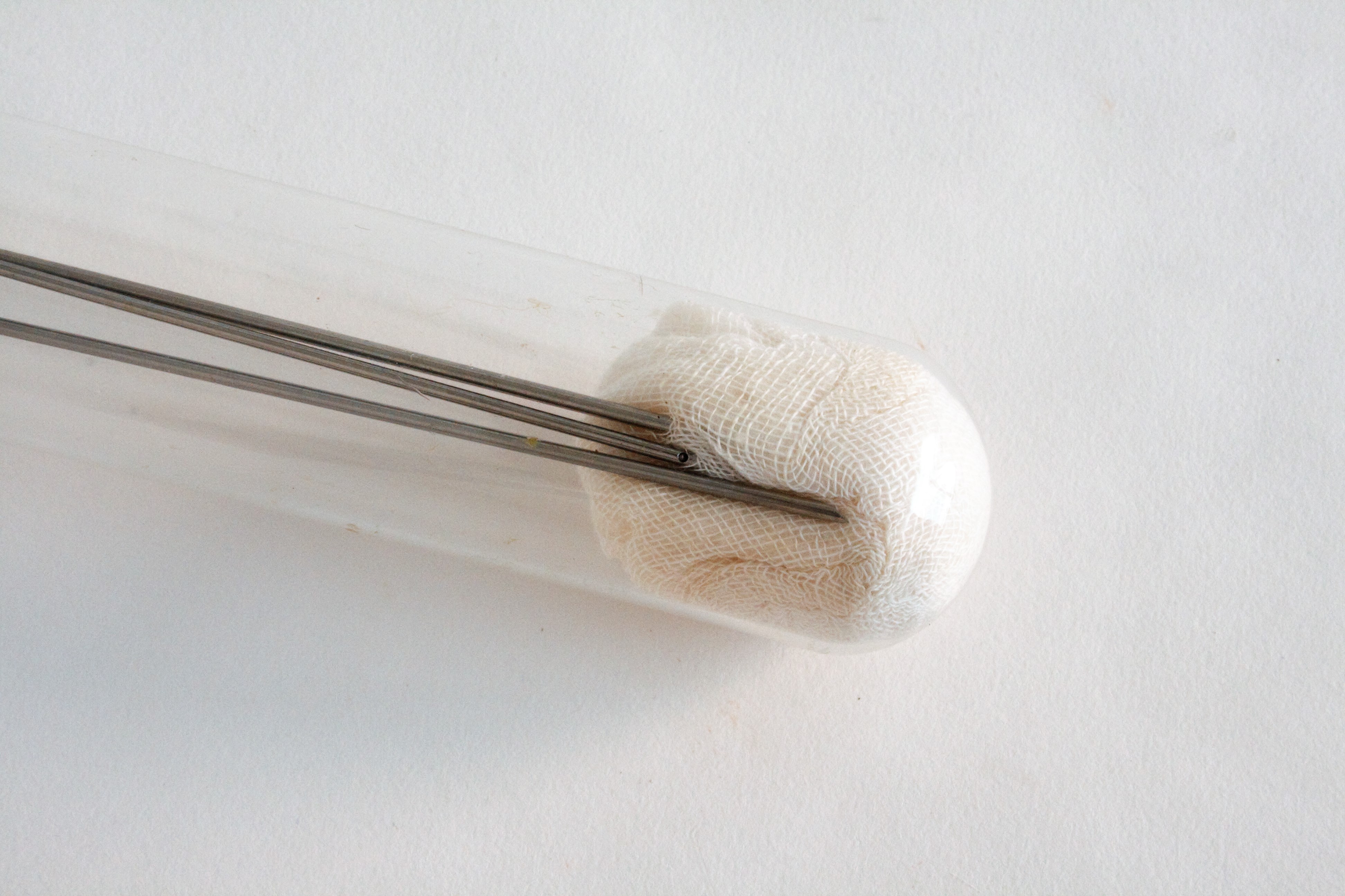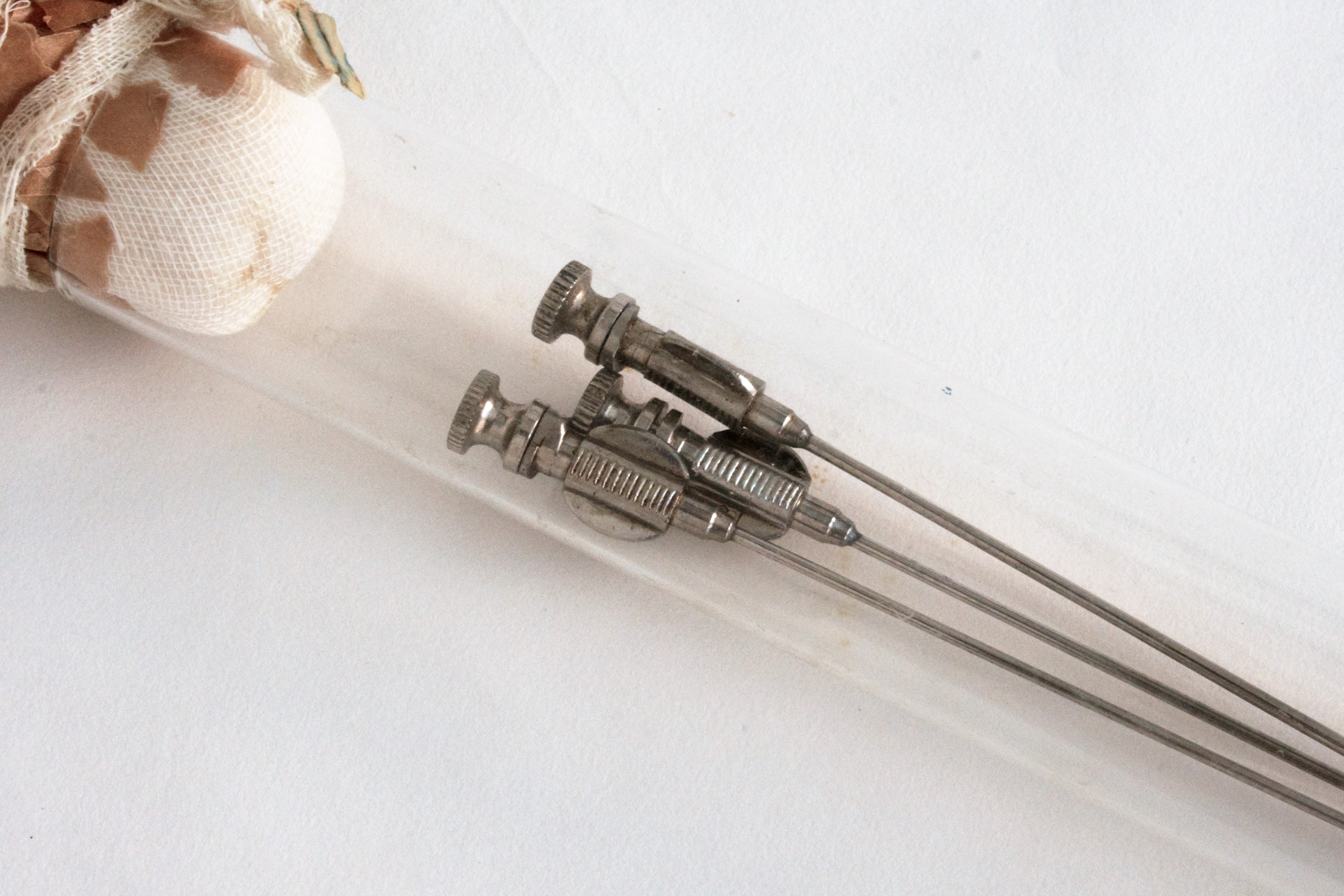 Tre aghi contenuti in provetta tamponata con cappuccio