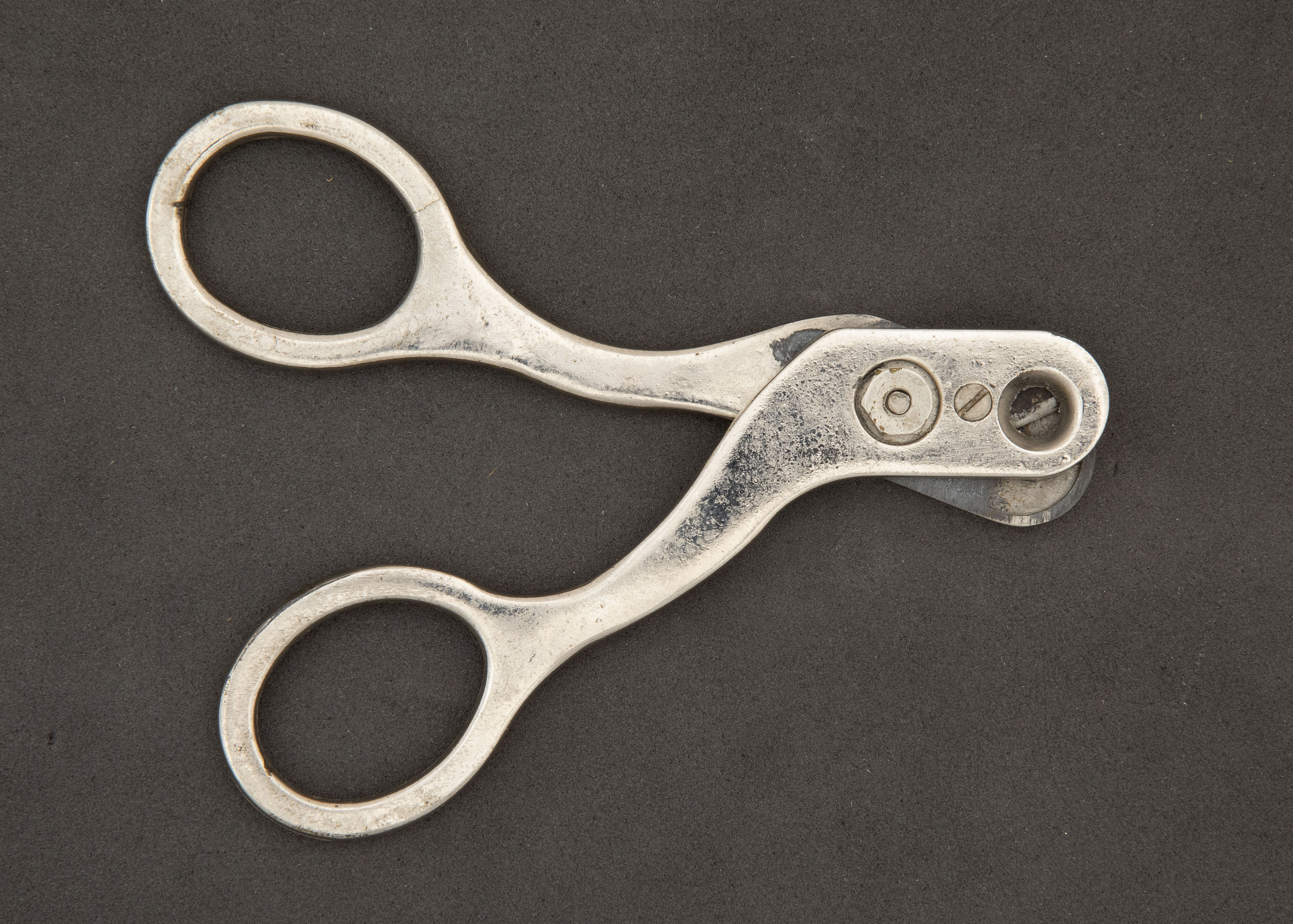 Oggetto in metallo, con impugnatura ad occhielli, simile ad una forbice ma, al posto delle lame, sono presenti due brevi bracci metallici, con un foro ciascuno, uno più grande l’altro più piccolo, per l’inserimento della puntina. Modalità d’uso:inserire la puntina negli appositi fori e, facendola ruotare manualmente, agire sulla punta per sfregamento attraverso l’inserimento di pollice e medio nei due anelli presenti dall’altro estremo del perno rispetto ai fori