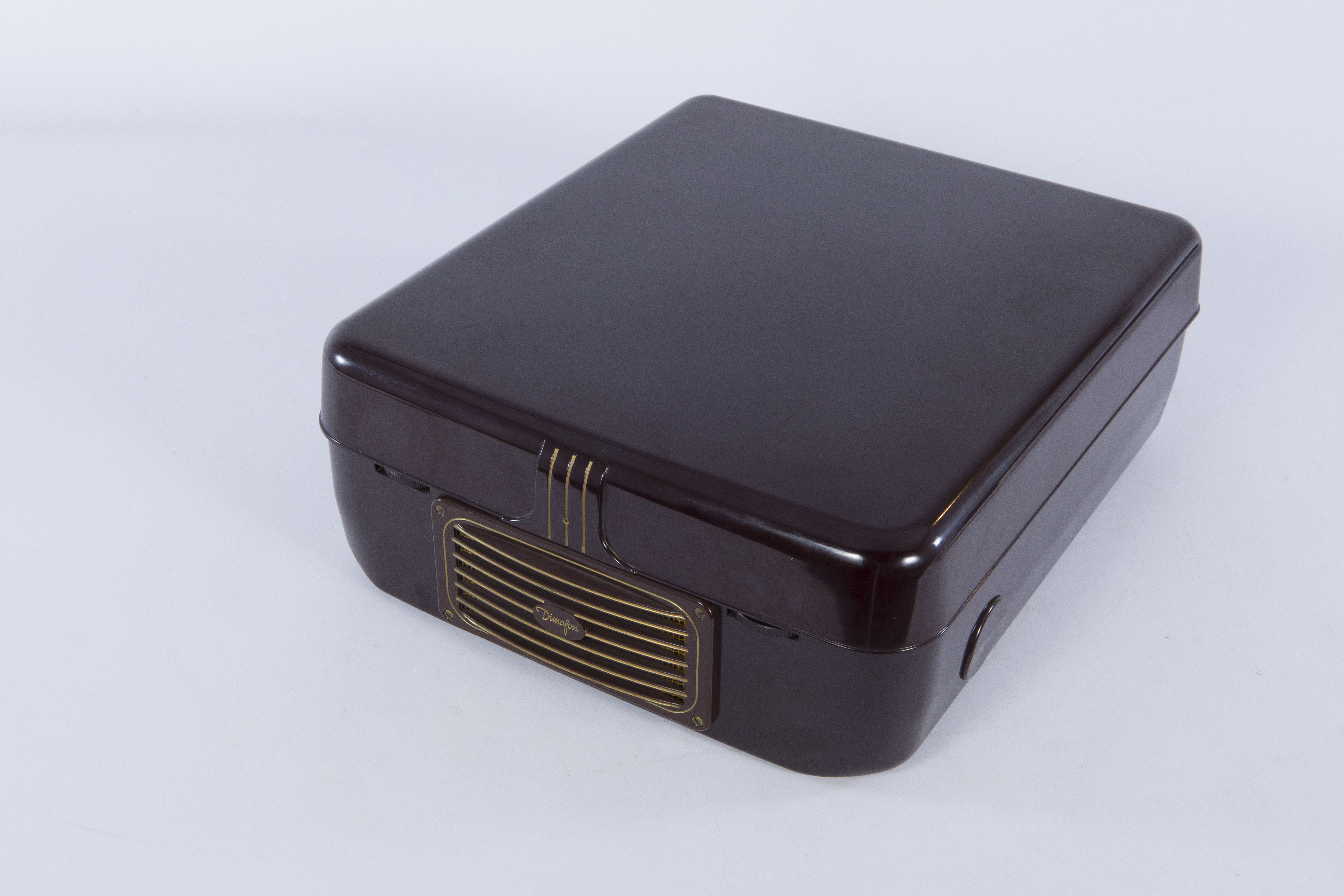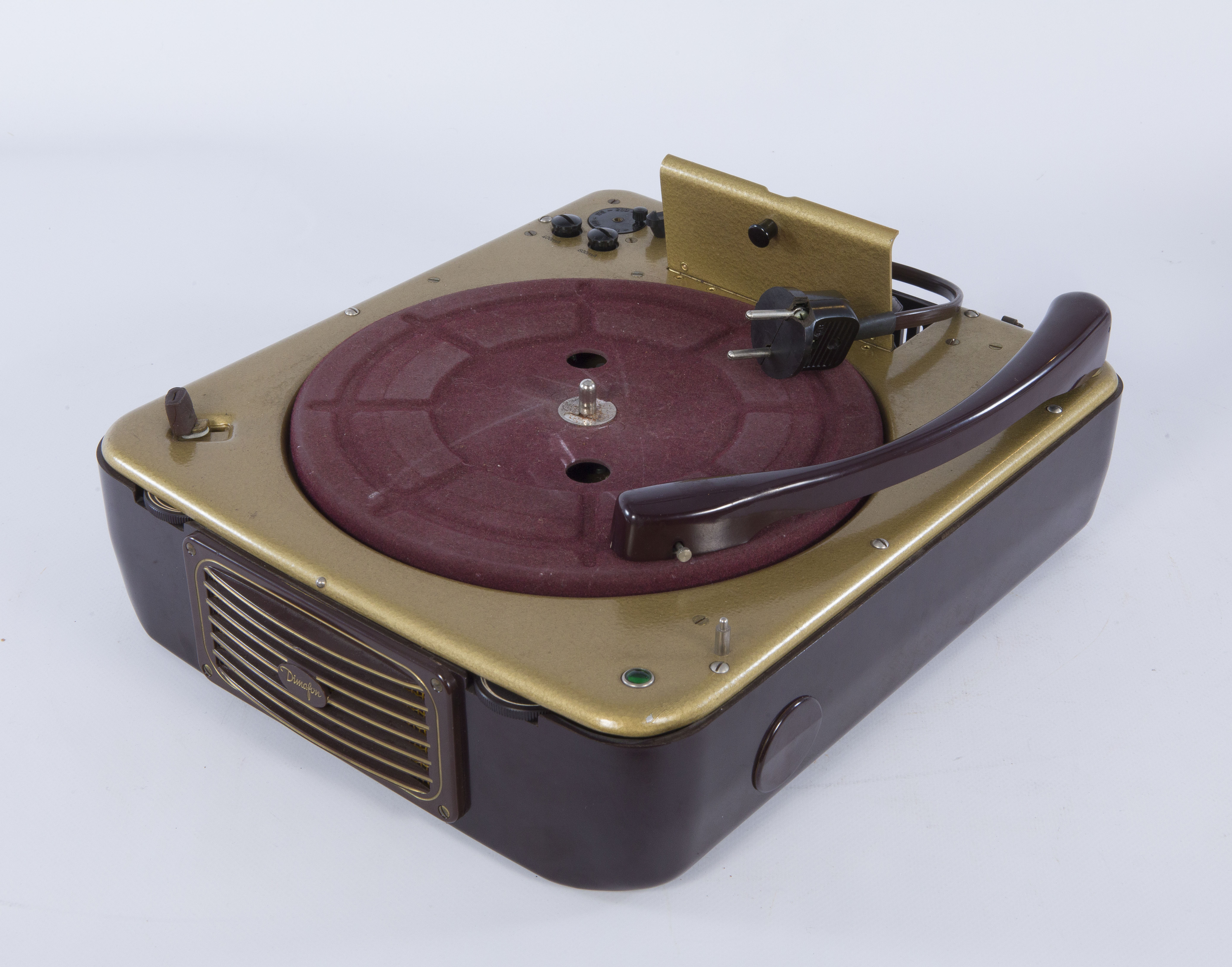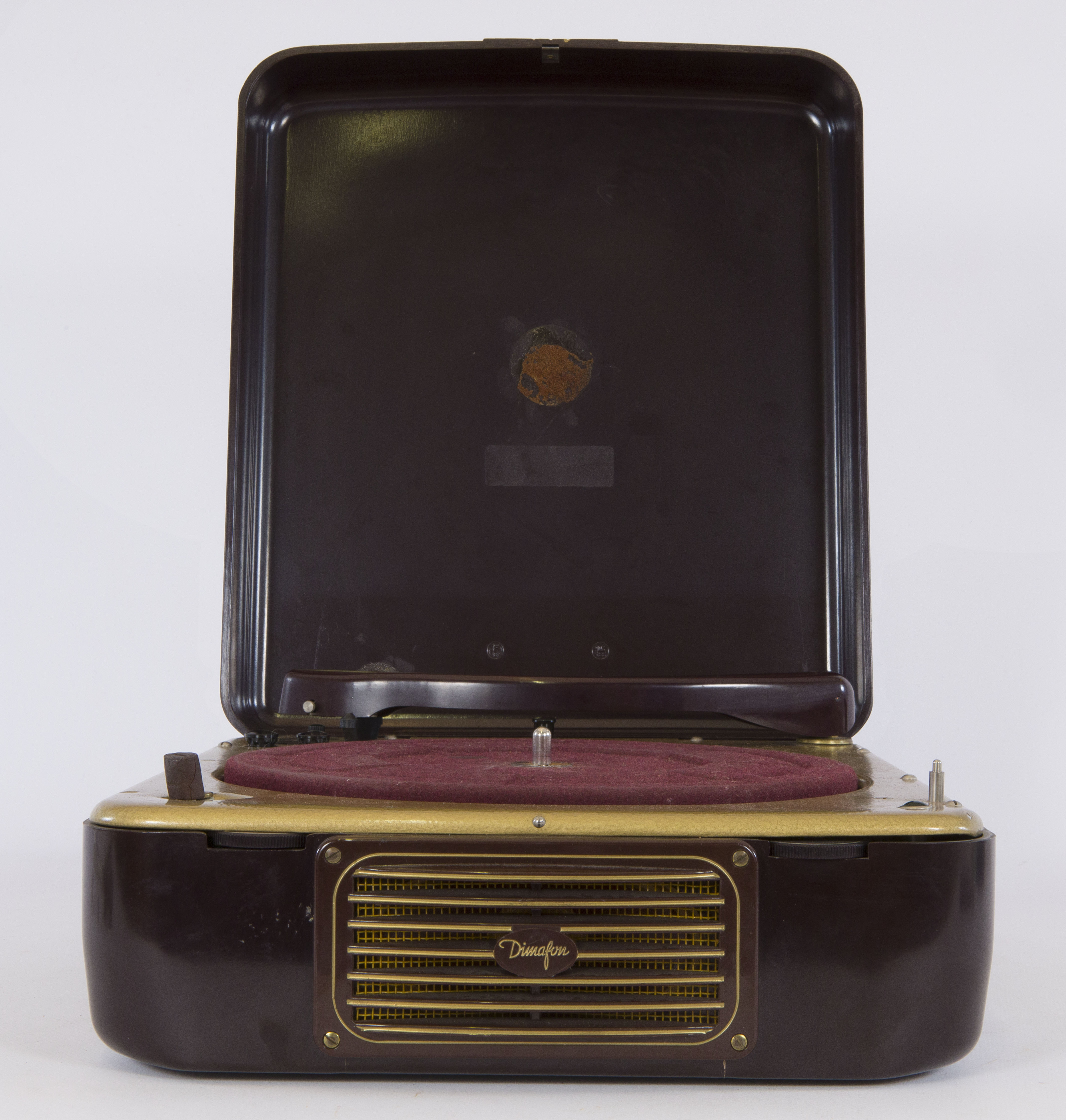 Contenitore: la base rettangolare in bachelite sostiene uno chassis in metallo, anch'esso di forma rettangolare. Un coperchio removibile, anch'esso in bachelite, copre l'intero apparecchio. All'interno dello chassis si trovano il motore ei circuiti elettrici. Sul piano superiore è posizionato il piatto, rivestito di feltro rosso, mentre sulla destra del piatto è situato il braccio in bachelite, che ospita il fonorivelatore elettromagnetico. I comandi, posti a sinistra del piatto, consistono in due manopole per la registrazione e la regolazione del volume. Sempre sul piano superiore, a destra, si trova una spia luminosa verde di accensione e un perno per l’appoggio del braccio, mentre a sinistra c'è una levetta di freno. Sul lato sinistro è presente l’ingresso per le cuffie. Sul retro dell'apparecchio è presente l’ingresso per il cavo di alimentazione e l’ingresso per il telefono o il microfono, accanto alla presa d'aria per il motore. La parte frontale è dotata di una griglia protettiva per l'altoparlante, che permette la diffusione del suono e due rotelle per regolare probabilmente il volume e il tono. Motore: a corrente alternata 95 - 240 Volt 50 Hz e 45 Watt. Sistema di riproduzione del suono: braccio con testina elettromagnetica. Modalità d’uso: collegare il dimafono a un telefono o a un microfono. Posizionare il disco sul piatto designato e abbassare la testina di lettura/registrazione sul disco. La testina, dotata di una punta elettromagnetica e di un traferro, trasferisce i segnali dal disco all'amplificatore. Regolare il volume e il tono della registrazione, quindi sbloccare la levetta del freno per avviare la registrazione. Una volta completata la registrazione, sia essa una chiamata o un'altra sessione, è possibile riprodurre le registrazioni direttamente dal disco. Questo consente agli utenti di ascoltare le registrazioni e, se necessario, prendere appunti o trascrivere le conversazioni