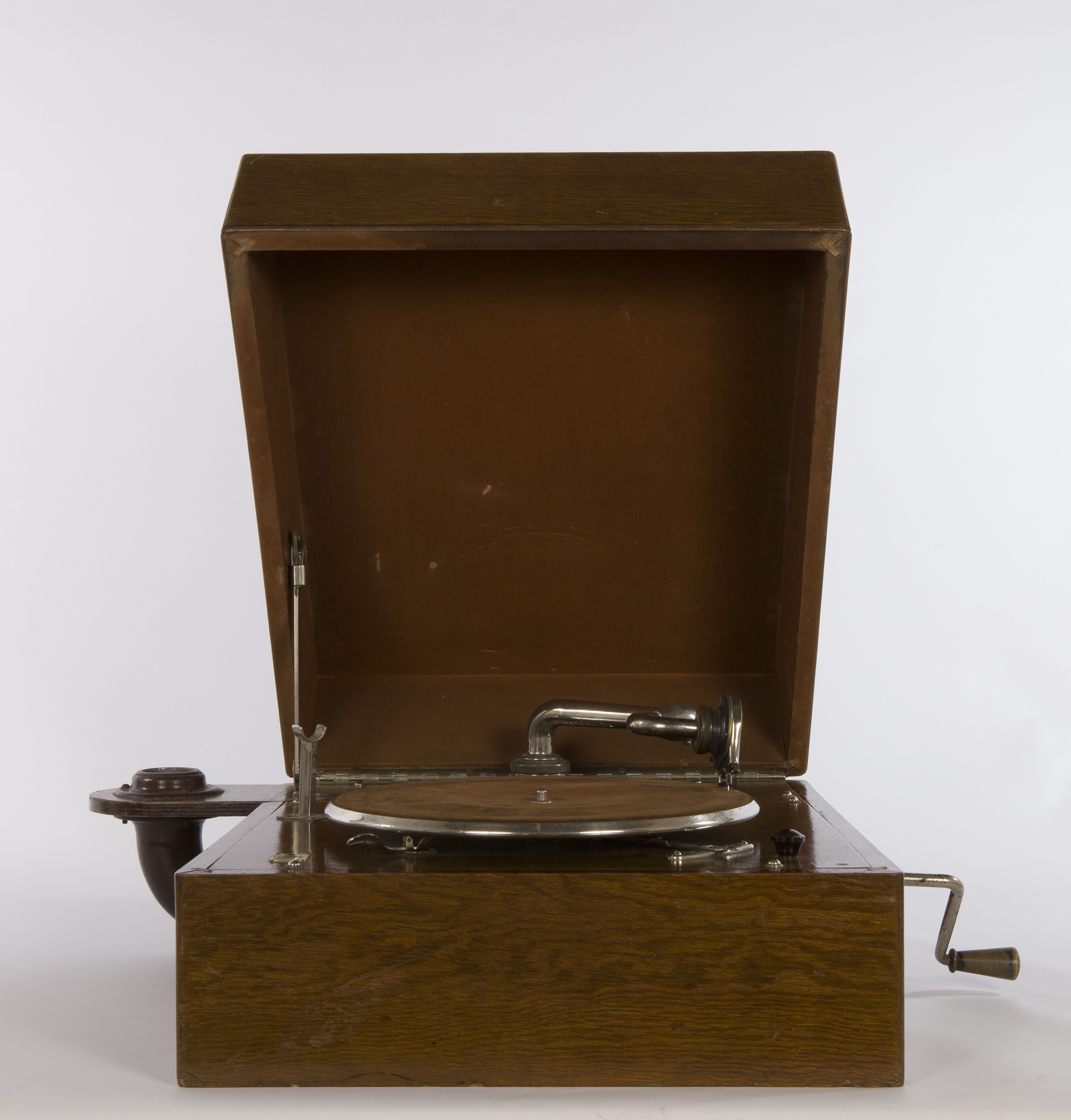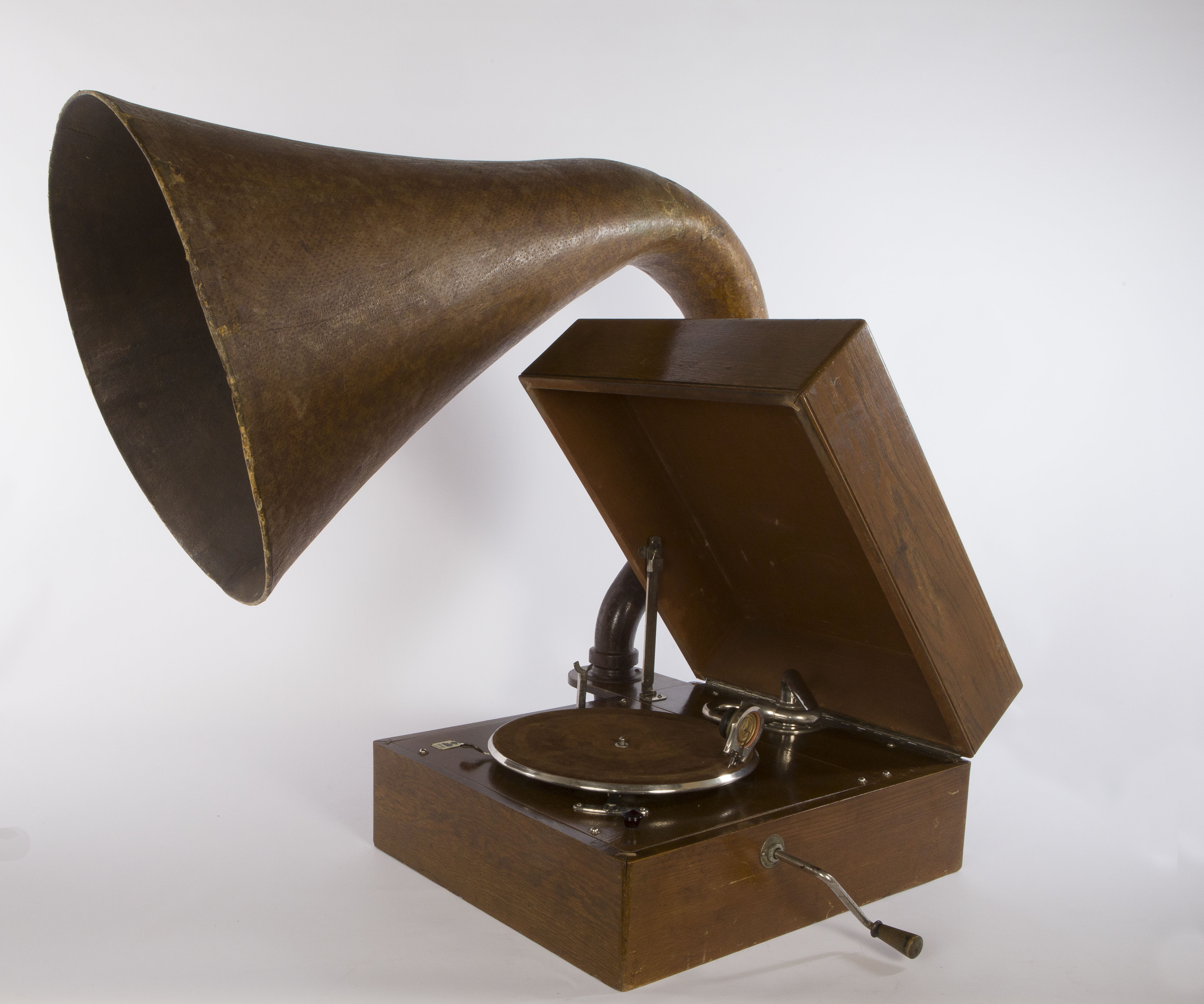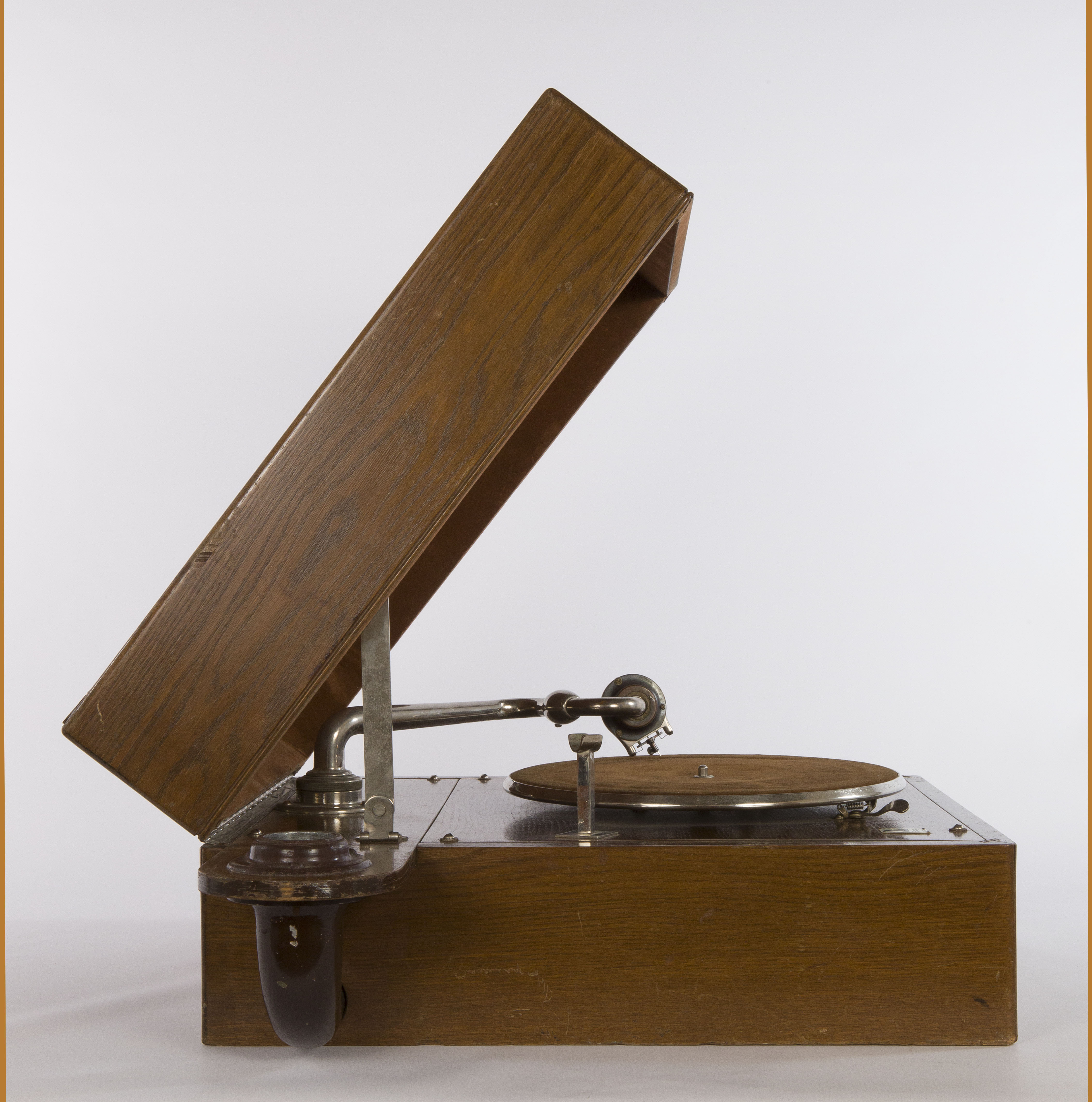Contenitore: scatola rettangolare in legno con coperchio incernierato. Sul lato destro è presente il foro per l’inserimento della manovella mentre sul lato sinistro si protende esternamente alla cassa il raccordo che collega il braccio alla tromba acustica di grandi dimensioni e dalla forma insolita. Il motore è occultato all’interno della scatola sotto una piastra in legno sulla quale sono montati il piatto del disco, il braccio acustico tubolare e a collo di cigno su cui viene fissato il diaframma, la leva del freno, il regolatore di velocità con il suo indicatore e un braccetto in metallo per appoggiare il braccio acustico quando la macchina non è in funzione. Motore: motore a due molle con sistema di carica a manovella; regolatore di velocità e sistema di bloccaggio del disco. Sistema di riproduzione del suono: tromba acustica connessa al braccio acustico tramite la scatola contenitrice e braccio acustico tubolare e a collo di cigno su cui è montato il diaframma. Modalità d’uso: inserire la manovella nel foro presente sulla cassa; collocare il disco inciso sul piatto, caricare il motore a molla attraverso la rotazione della manovella e appoggiare sul disco la puntina o stilo del diaframma (dall’esterno all’interno). La puntina inizia a scorrere all'interno del solco a spirale inciso sul disco; le oscillazioni della puntina, prodotte dal profilo irregolare dell'incisione, vengono trasmesse alla membrana del diaframma che riproduce il suono, amplificato dalla cassa dalla tromba acustica