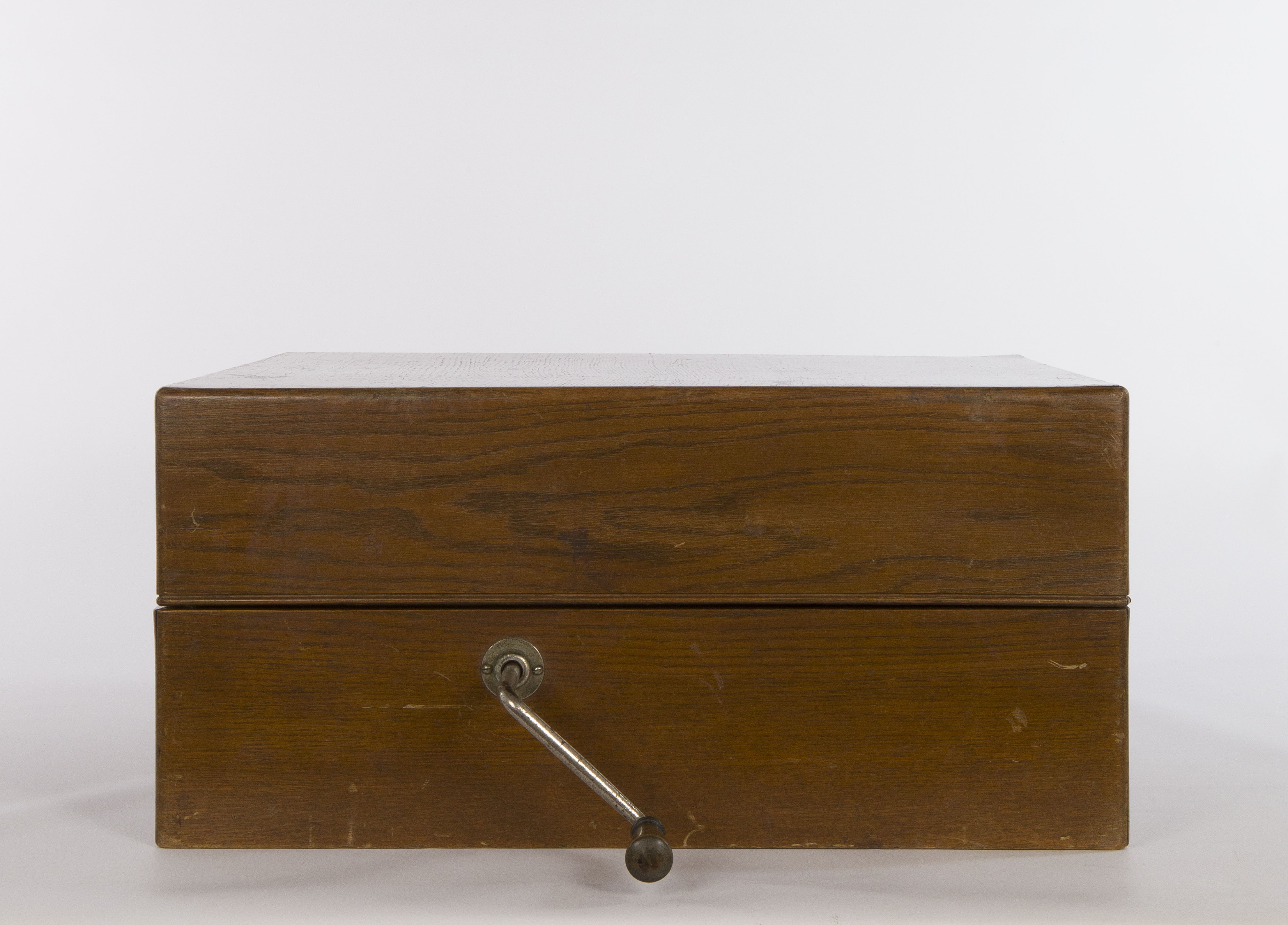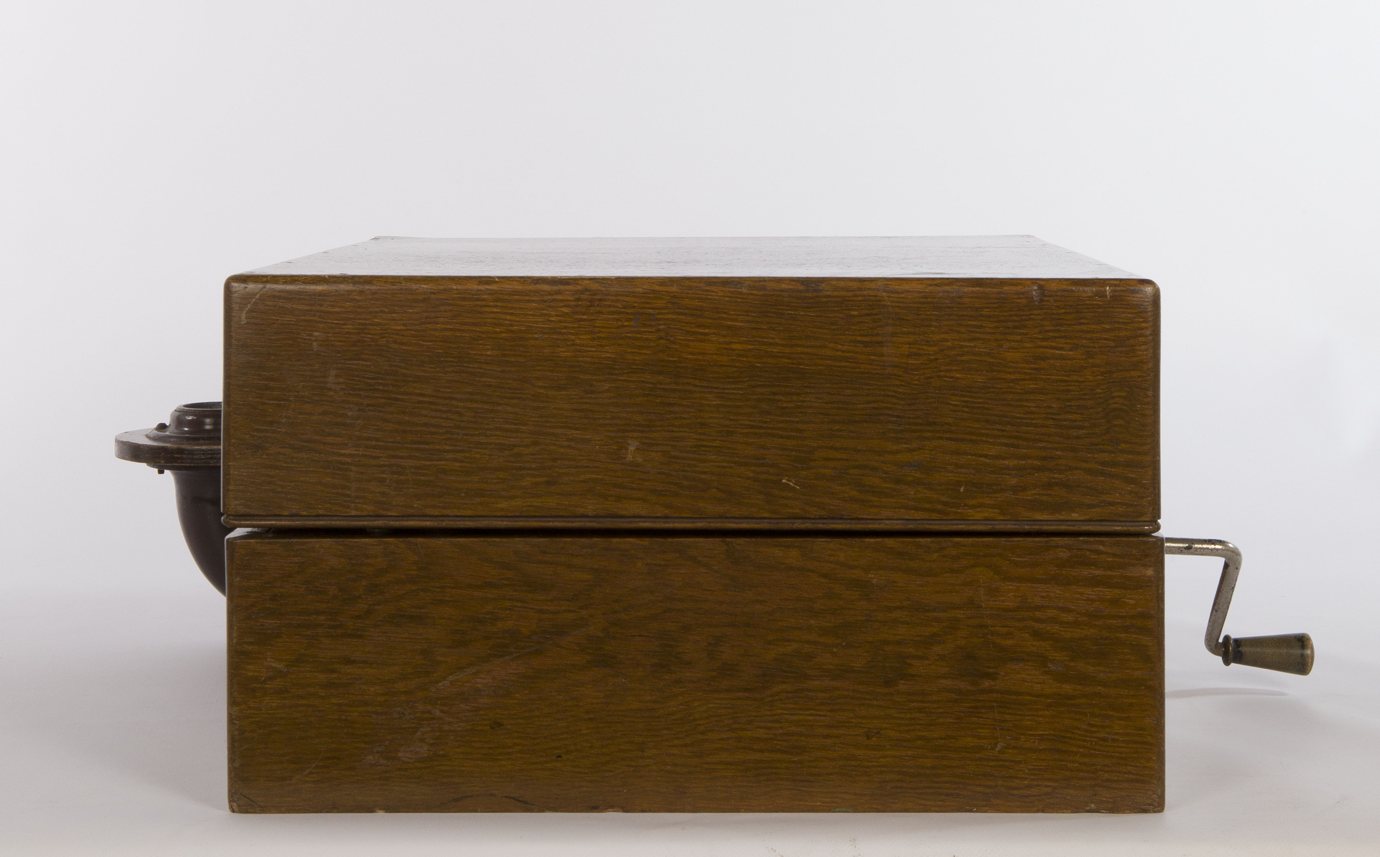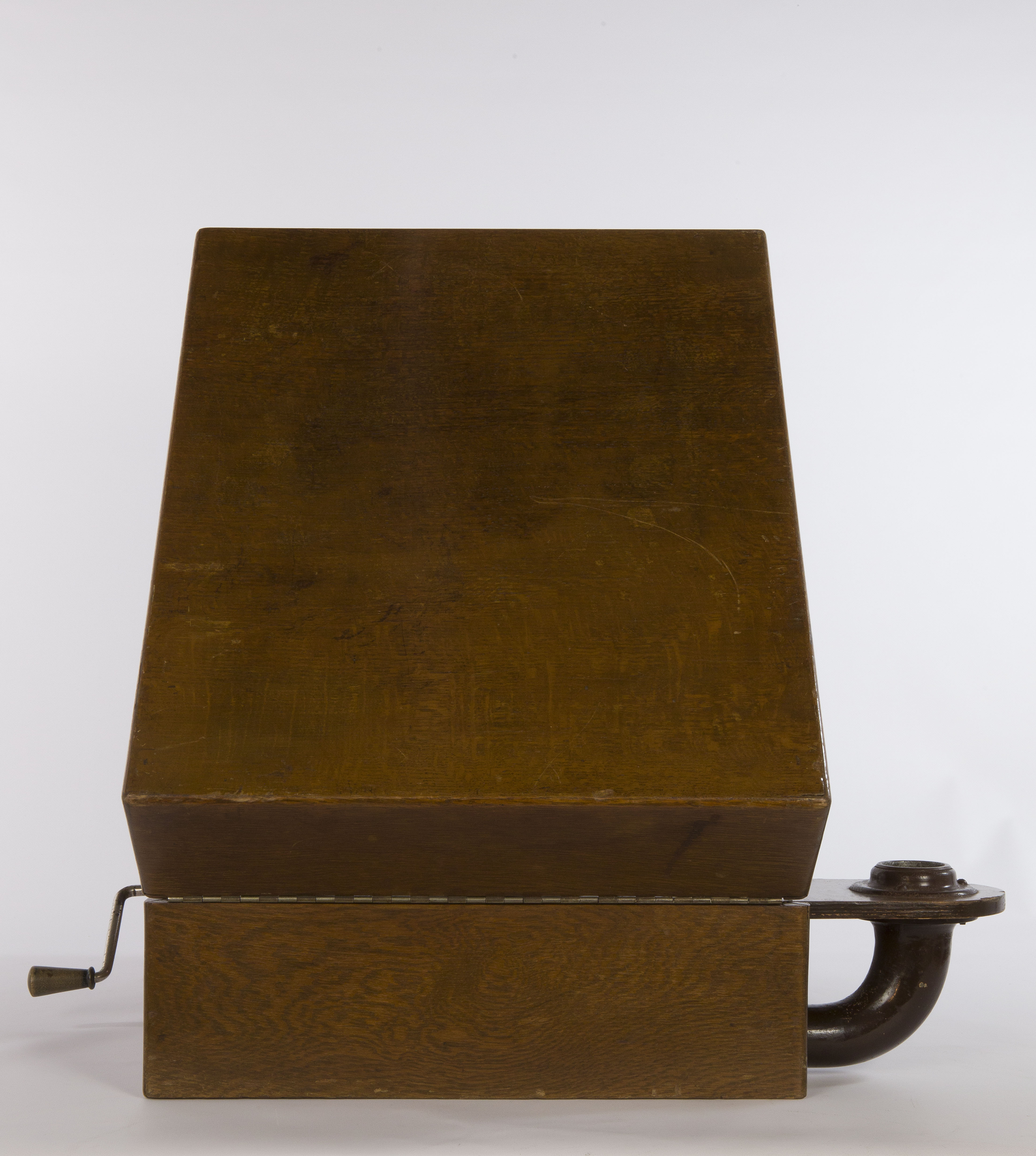 Contenitore: scatola rettangolare in legno con coperchio incernierato. Sul lato destro è presente il foro per l’inserimento della manovella mentre sul lato sinistro si protende esternamente alla cassa il raccordo che collega il braccio alla tromba acustica di grandi dimensioni e dalla forma insolita. Il motore è occultato all’interno della scatola sotto una piastra in legno sulla quale sono montati il piatto del disco, il braccio acustico tubolare e a collo di cigno su cui viene fissato il diaframma, la leva del freno, il regolatore di velocità con il suo indicatore e un braccetto in metallo per appoggiare il braccio acustico quando la macchina non è in funzione. Motore: motore a due molle con sistema di carica a manovella; regolatore di velocità e sistema di bloccaggio del disco. Sistema di riproduzione del suono: tromba acustica connessa al braccio acustico tramite la scatola contenitrice e braccio acustico tubolare e a collo di cigno su cui è montato il diaframma. Modalità d’uso: inserire la manovella nel foro presente sulla cassa; collocare il disco inciso sul piatto, caricare il motore a molla attraverso la rotazione della manovella e appoggiare sul disco la puntina o stilo del diaframma (dall’esterno all’interno). La puntina inizia a scorrere all'interno del solco a spirale inciso sul disco; le oscillazioni della puntina, prodotte dal profilo irregolare dell'incisione, vengono trasmesse alla membrana del diaframma che riproduce il suono, amplificato dalla cassa dalla tromba acustica