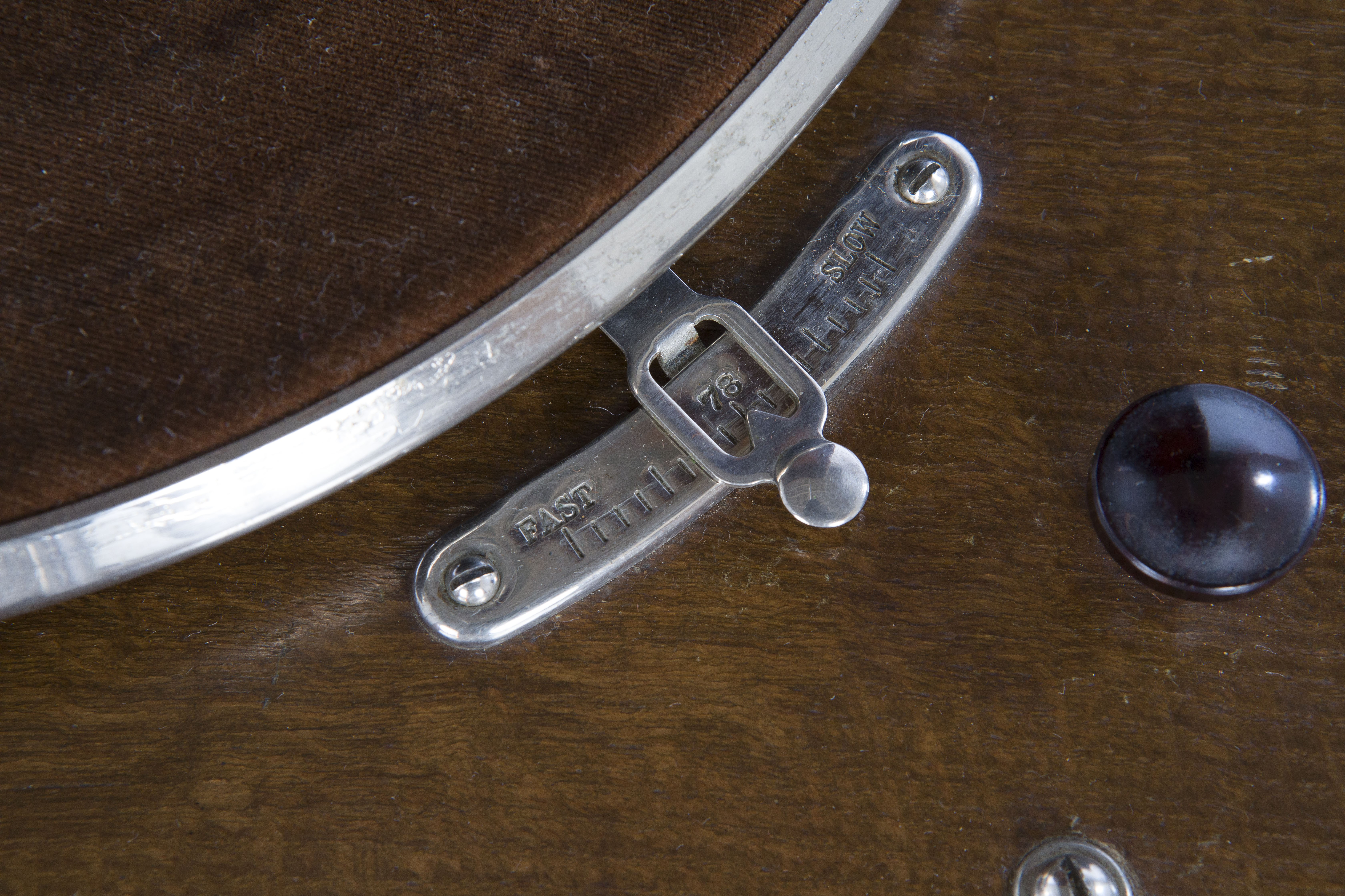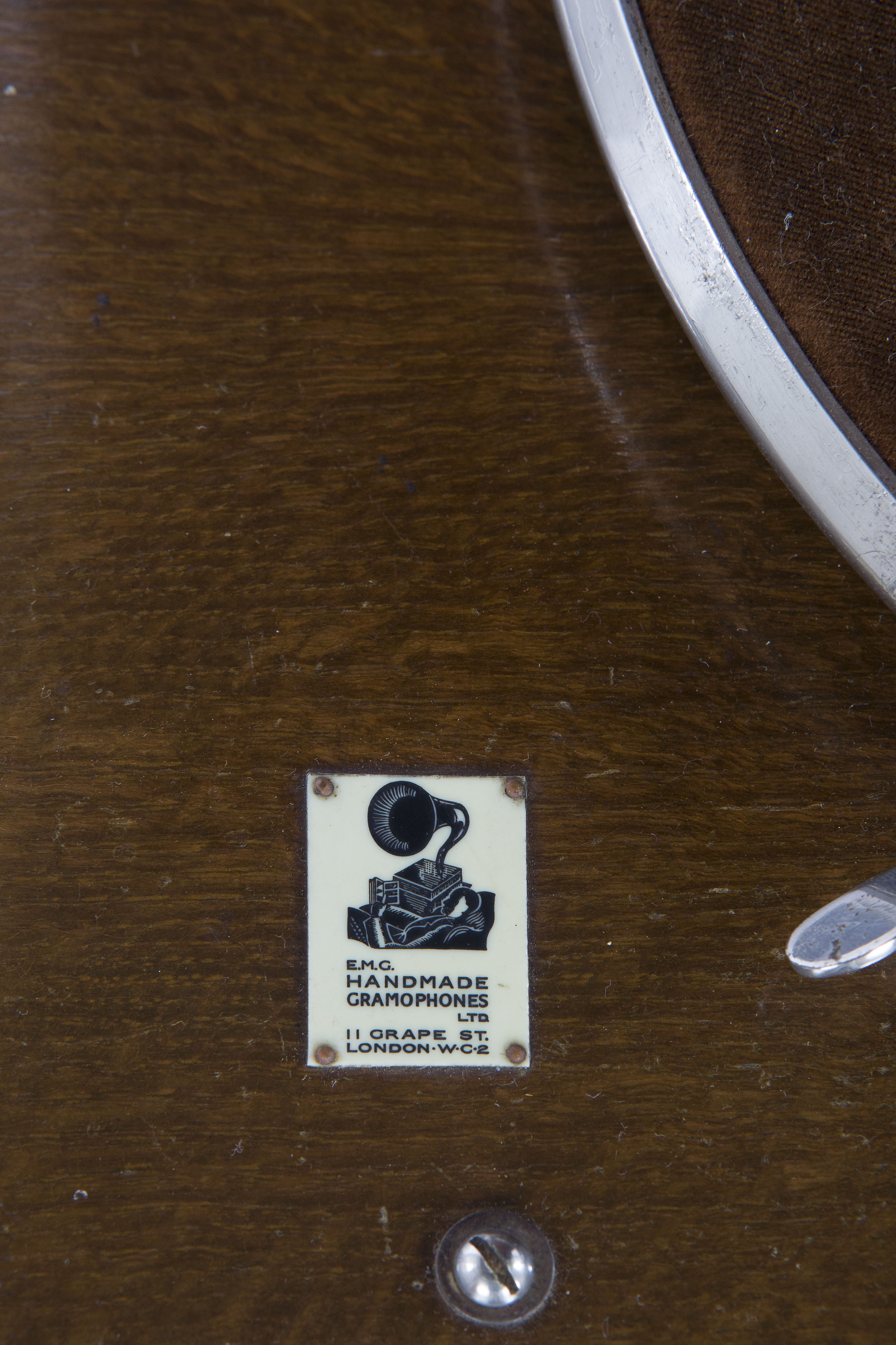 - ISCRIZIONI piano del piatto del disco - E.M.G. / HANDMADE / GRAMOPHONES / LTD. / 11 GRAPE ST. / LONDON W-C-2”regolatore di velocità “FAST 78 SLOW - maiuscolo - inglese