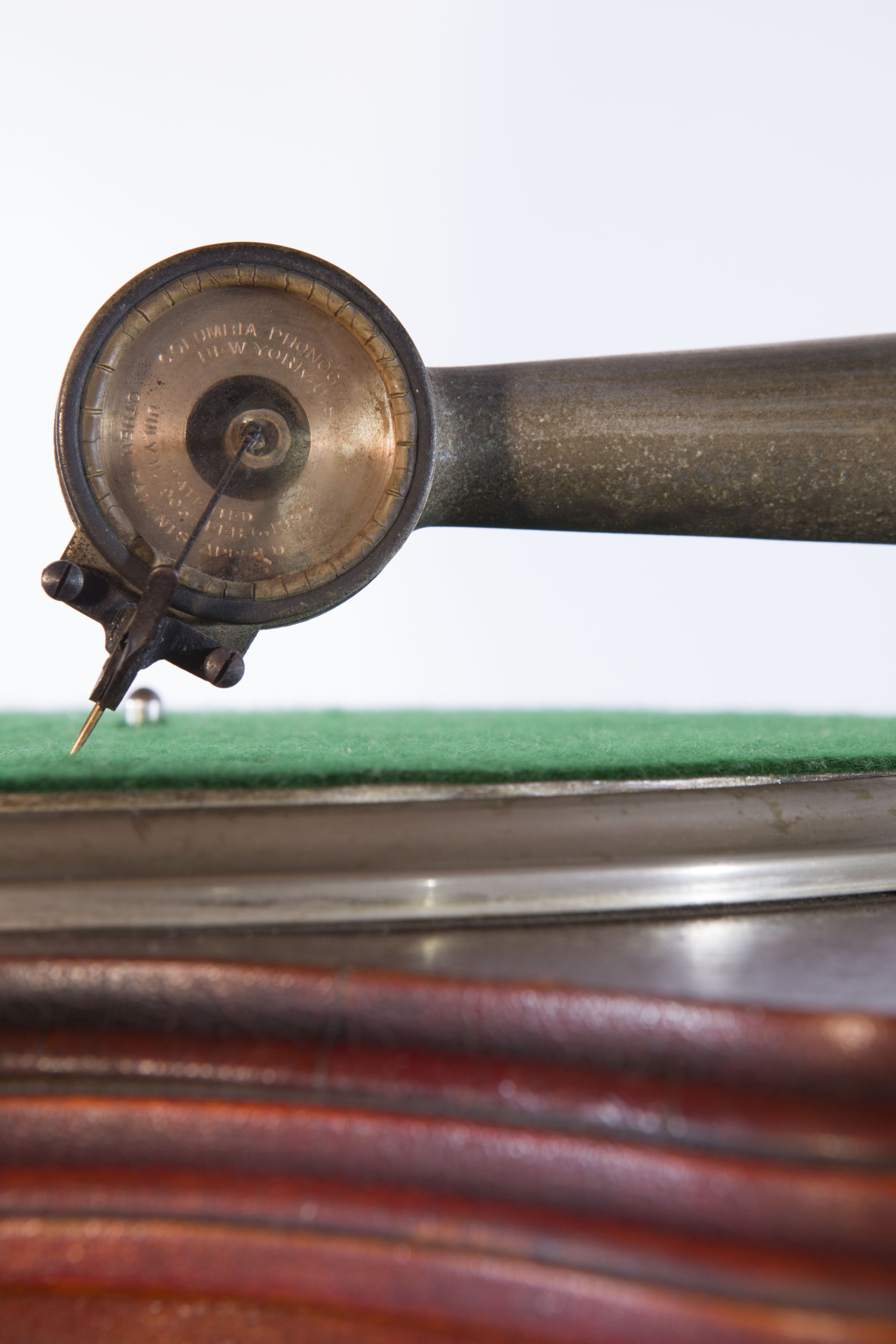 - NOTIZIE STORICO CRITICHE L’industria del suono riprodotto iniziò nel 1877 negli Stati Uniti quando Thomas Edison inventò una maniera di registrare il suono su un foglio di alluminio e di riprodurlo tramite una macchina che chiamò fonografo. Nel corso di una decina di anni, questo sistema venne notevolmente migliorato con l’invenzione nel 1886 dei cilindri di cera Bell-Tainter e poi nel 1887 con l’invenzione del disco e l’adozione dell’incisione orizzontale fatta da Emile Berliner che non solo riproduceva il suono con molta più facilità ma rendeva anche la duplicazione molto più agevole. All’invenzione del disco Berliner accompagnò l’invenzione di una macchina per riprodurlo ovvero il grammofono che venne perfezionata nel 1896 da Eldridge R. Johnson con l’aggiunta del motore a molla. La storia del marchio Columbia risale alle prime fasi della storia della riproduzione del suono, in particolare a partire dal brevetto depositato da Charles Sumner Tainter e da Alexander Graham Bell nel Maggio del 1885 con il numero 341.214: l’invenzione dei due scienziati sostituì lo stilo d’indentazione di Edison con uno stilo da incisione o taglio (detto stilo galleggiante) e introdusse l’invenzione dei cilindri di cartone ricoperti di cera, al posto del foglio di stagno sperimentato da Edison. Nata nel 1887 a Washington DC come “American Graphophone Company”, la società americana inizialmente utilizzò i brevetti di Charles Sumner Tainter e Alexander Graham Bell per produrre e vendere macchine a cilindro per uso aziendale, quindi con la funzione di dittafoni. Il progetto delle vendite delle macchine per uso aziendale fallì e la American Graphophone Company cominciò, a partire dal 1891, a orientarsi verso la produzione per l’intrattenimento. Nel 1895, infatti, la American Graphophone Company acquisì le azioni della “Columbia Phonograph Company”, una società di successo attiva nel distretto di Columbia rivenditrice di fonografi Edison, di grafofoni Bell e parallelamente di cilindri pre-registrati da cui deriverà il colosso discografico “Columbia Records”. La American Graphophone Company si consolidò trasformando se stessa in società produttrice e la Columbia Phonograph Company nella principale azienda distributrice dei suoi grafofoni. La Columbia Phonograph Company iniziò nel 1896 a vendere anche dischi e grammofoni e venne riorganizzata nel 1906 cambiando ragione sociale in “Columbia Graphophone Company”. Dato il grande successo dei suoi prodotti in Europa, nel 1922 venne aperta a Londra la società filiale “Columbia Phonograph Company Ltd.” da cui nascerà nel Marzo del 1931, dalla fusione di questa con la Gramophone Company Ltd. e la Parlophone Ltd., la nota società EMI, Electric and Musical Industries Ltd. Il grammofono Type BY venne fornito dalla Columbia a partire dal 1908 al prezzo di 65$ con tromba modello “Morning glory”. L’anno seguente per 20 $ in più, si poteva acquistare la tromba compatibile in abete rosso modello “Symphony”, come è il caso dell’esemplare descritto in questa scheda. Era possibile acquistare anche un piedistallo per grammofono su cui riporlo