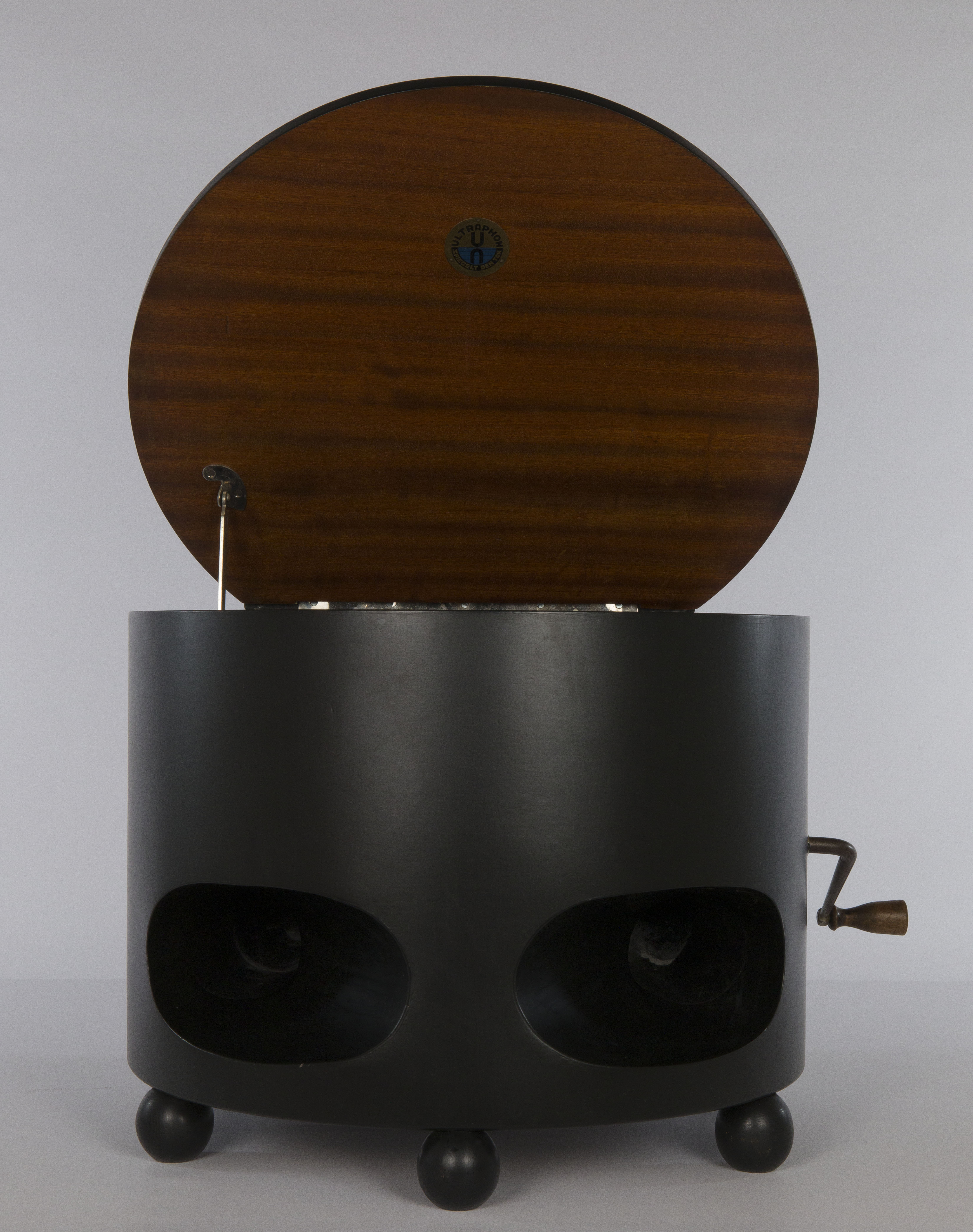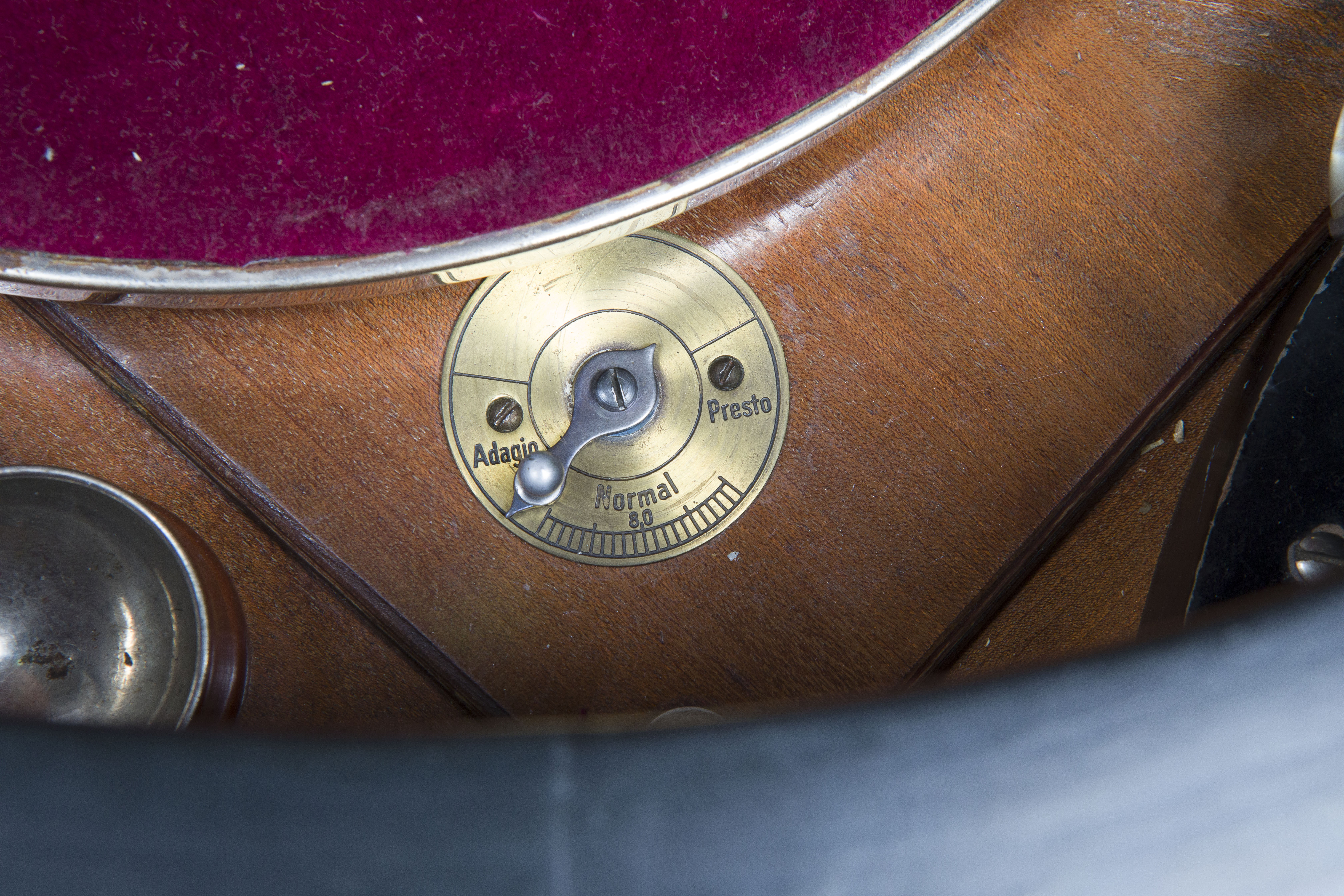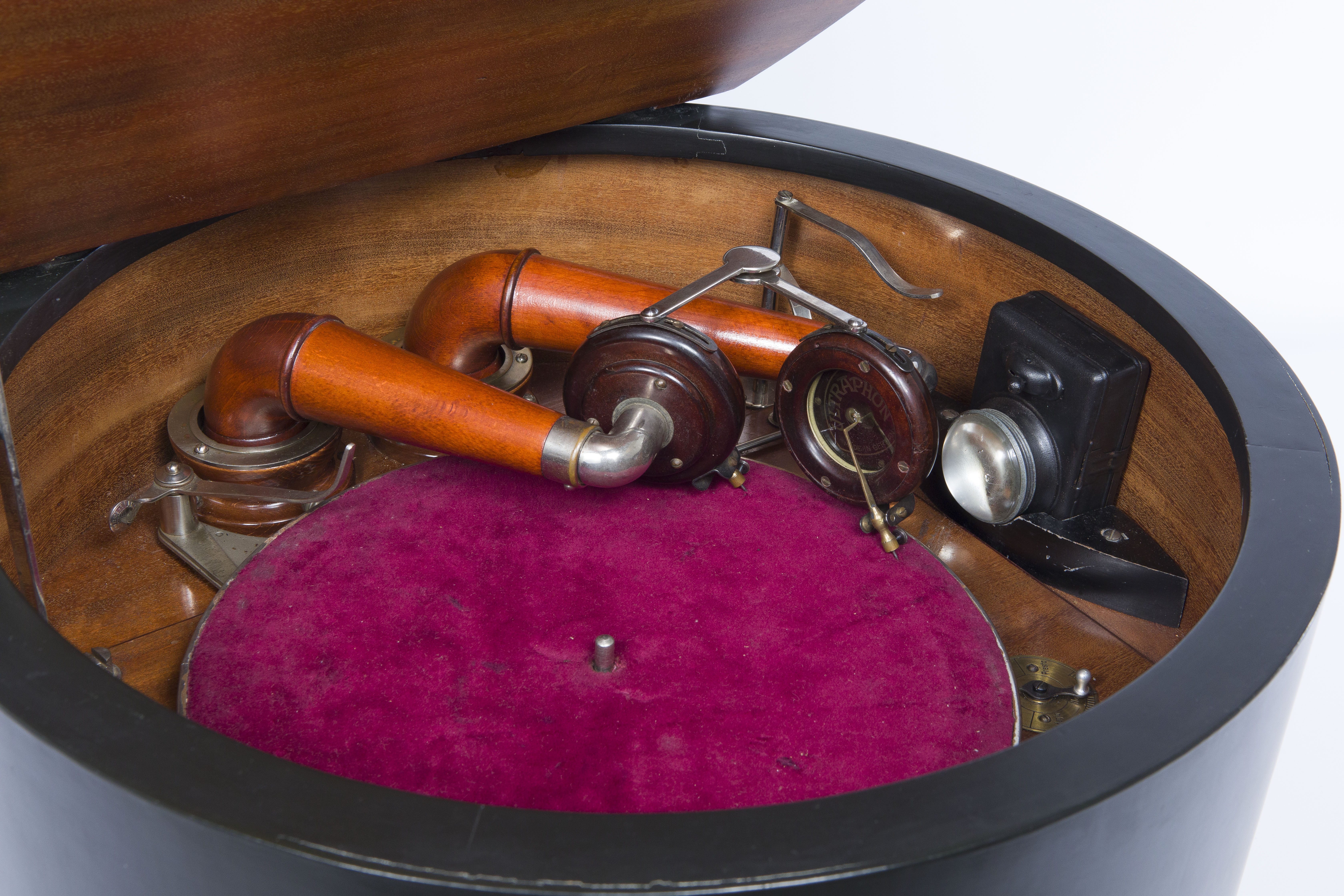 Contenitore: mobile di forma cilindrica in legno con quattro piedini di appoggio e coperchio incernierato. Sul lato frontale sono presenti due fori per la fuoriuscita del suono, sul lato destro è presente il foro per l’inserimento della manovella per la carica e due pomelli per regolare il volume o meglio l’apertura e la chiusura dei fori anteriori. Al di sotto del coperchio sono montati il piatto del disco con il sistema di freno e il regolatore di velocità con il suo indicatore e i due bracci acustici con i rispettivi diaframmi. Motore: a due molle con carica manuale a manovella; regolatore di velocità e freno. Sistema di riproduzione del suono: in questa macchina viene presentato uno dei primi tentativi di riproduttore del suono stereofonico. Sono, infatti, presenti due bracci acustici tubolari con i rispettivi diaframmi connessi con le due trombe interne al mobile della macchina. Modalità d’uso: inserire la manovella nel foro presente sul lato destro e caricare il motore a molla ruotando la manovella; selezionare la velocità di rotazione del piatto, collocare il disco inciso sul piatto e avviare la rotazione disattivando il sistema di blocco. Manovrare i due bracci acustici fino ad appoggiare sul disco la puntina o stilo del diaframma (dall’esterno all’interno) e avviare la rotazione; aprire gli sportelli presenti sul lato destro per amplificare il suono. Le puntine iniziano a scorrere all'interno del solco a spirale inciso sul disco; le oscillazioni delle puntine, prodotte dal profilo irregolare dell'incisione, vengono trasmesse alla membrana dei diaframmi che riproducono il suono andando a creare un effetto di riverbero dal quale deriva il suono stereofonico. Il suono viene amplificato dalle due trombe interne al contenitore