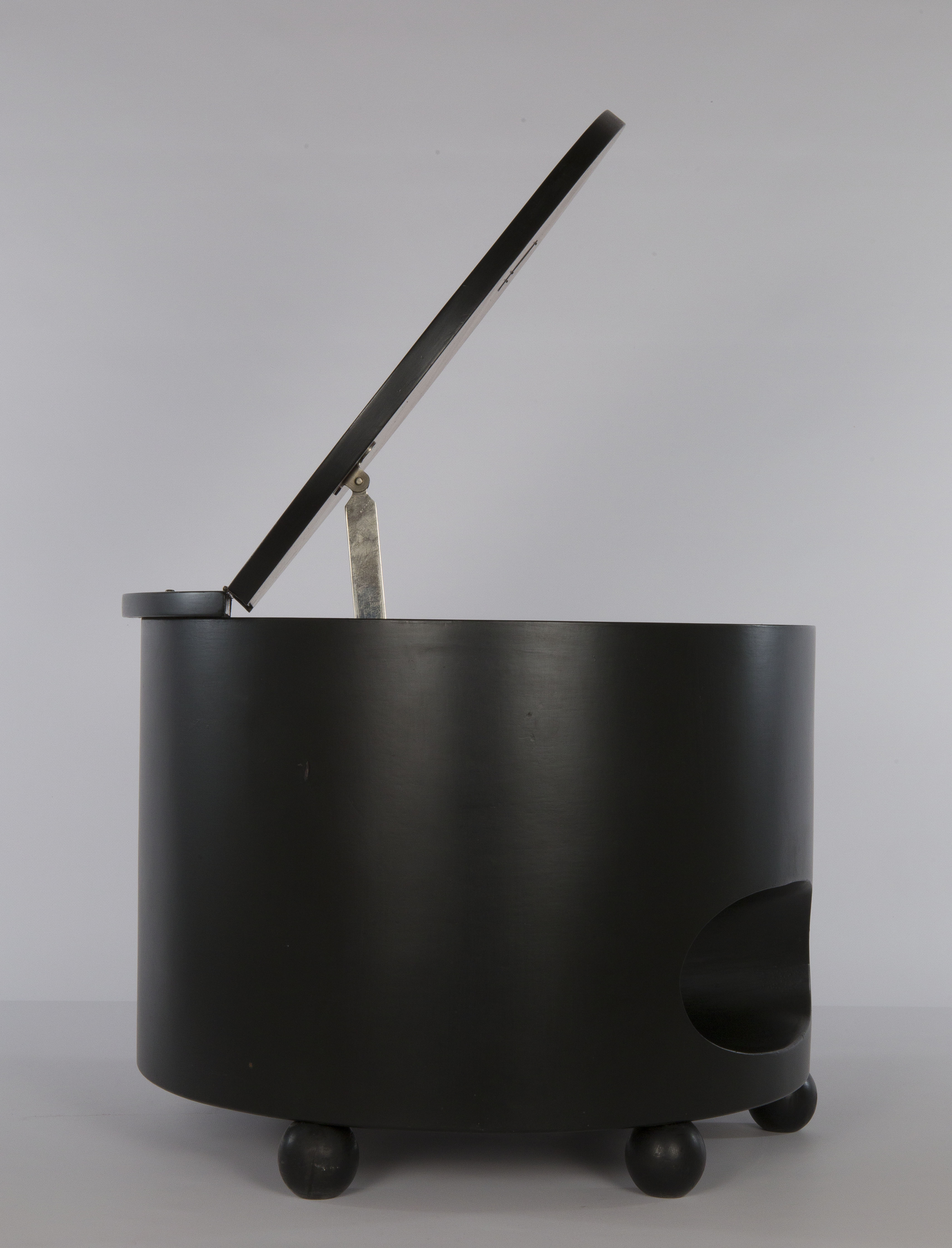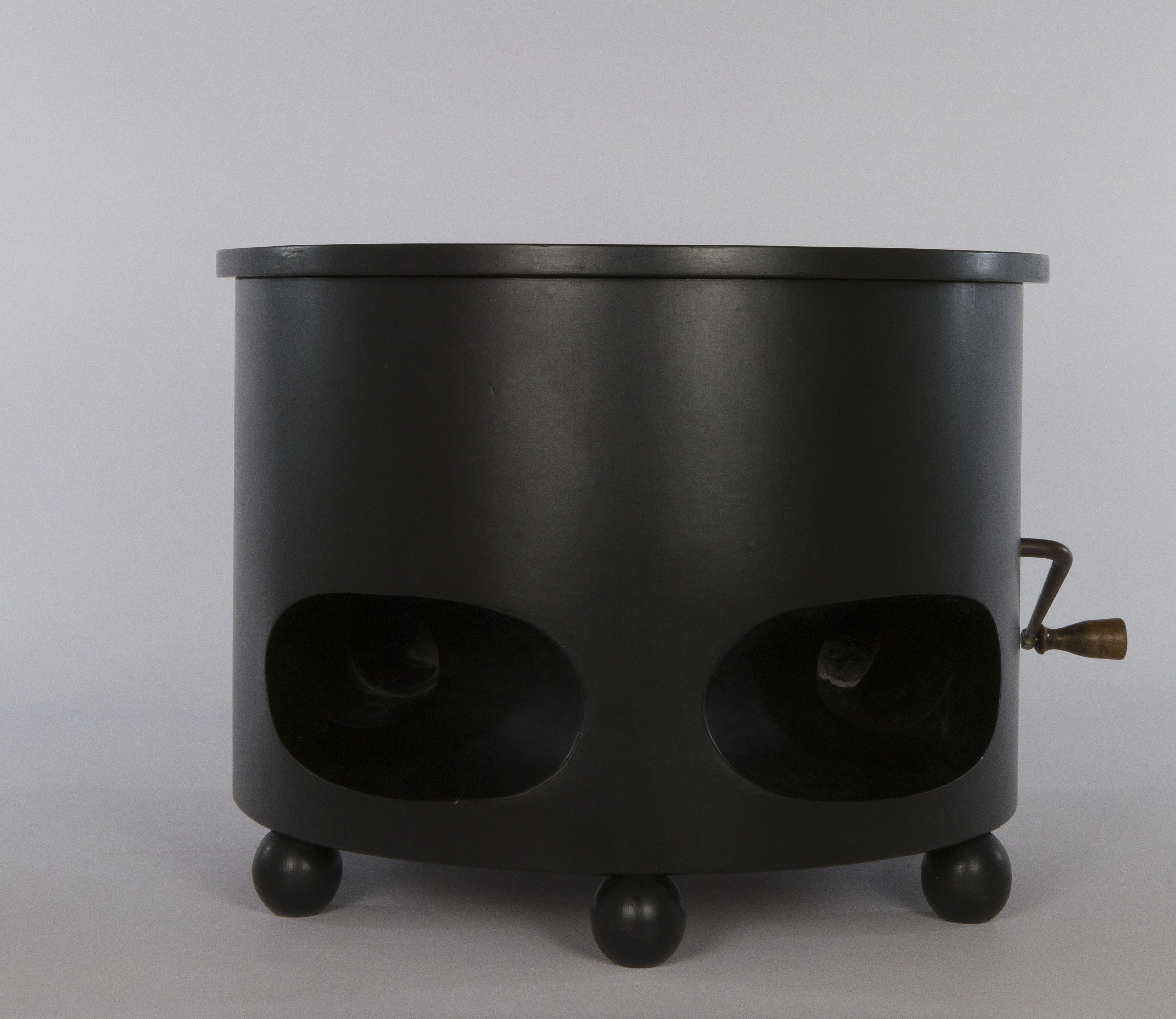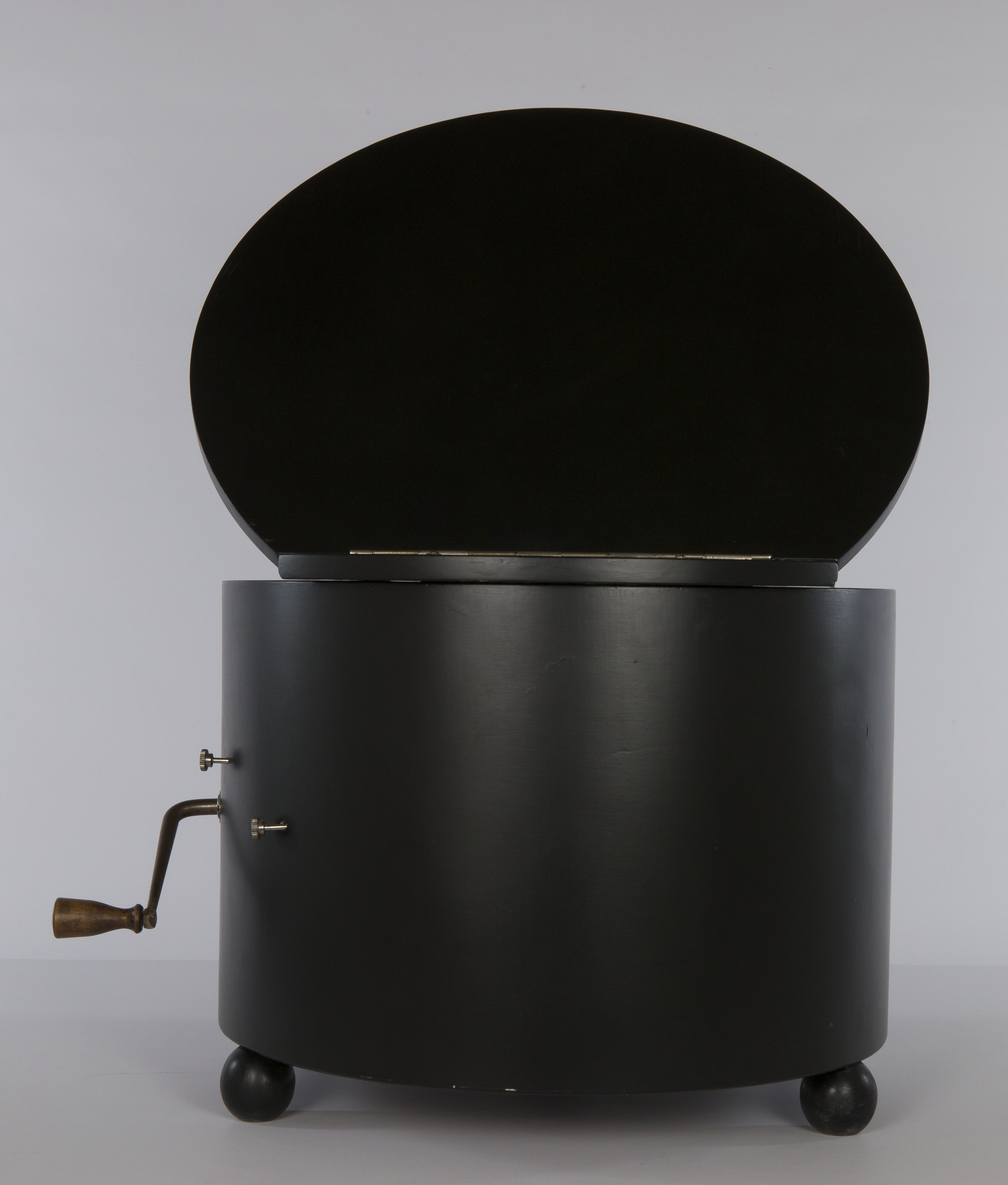 Contenitore: mobile di forma cilindrica in legno con quattro piedini di appoggio e coperchio incernierato. Sul lato frontale sono presenti due fori per la fuoriuscita del suono, sul lato destro è presente il foro per l’inserimento della manovella per la carica e due pomelli per regolare il volume o meglio l’apertura e la chiusura dei fori anteriori. Al di sotto del coperchio sono montati il piatto del disco con il sistema di freno e il regolatore di velocità con il suo indicatore e i due bracci acustici con i rispettivi diaframmi. Motore: a due molle con carica manuale a manovella; regolatore di velocità e freno. Sistema di riproduzione del suono: in questa macchina viene presentato uno dei primi tentativi di riproduttore del suono stereofonico. Sono, infatti, presenti due bracci acustici tubolari con i rispettivi diaframmi connessi con le due trombe interne al mobile della macchina. Modalità d’uso: inserire la manovella nel foro presente sul lato destro e caricare il motore a molla ruotando la manovella; selezionare la velocità di rotazione del piatto, collocare il disco inciso sul piatto e avviare la rotazione disattivando il sistema di blocco. Manovrare i due bracci acustici fino ad appoggiare sul disco la puntina o stilo del diaframma (dall’esterno all’interno) e avviare la rotazione; aprire gli sportelli presenti sul lato destro per amplificare il suono. Le puntine iniziano a scorrere all'interno del solco a spirale inciso sul disco; le oscillazioni delle puntine, prodotte dal profilo irregolare dell'incisione, vengono trasmesse alla membrana dei diaframmi che riproducono il suono andando a creare un effetto di riverbero dal quale deriva il suono stereofonico. Il suono viene amplificato dalle due trombe interne al contenitore