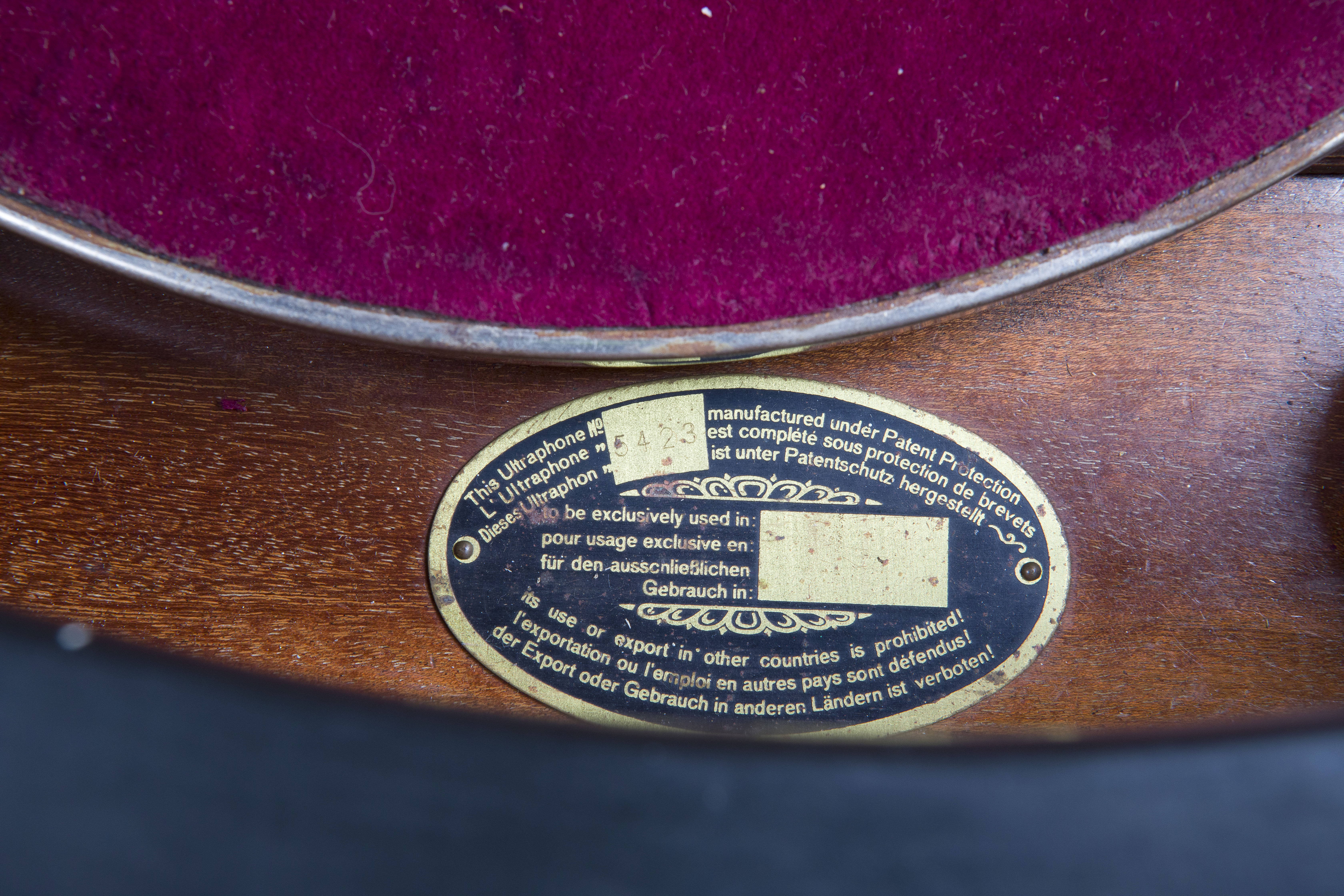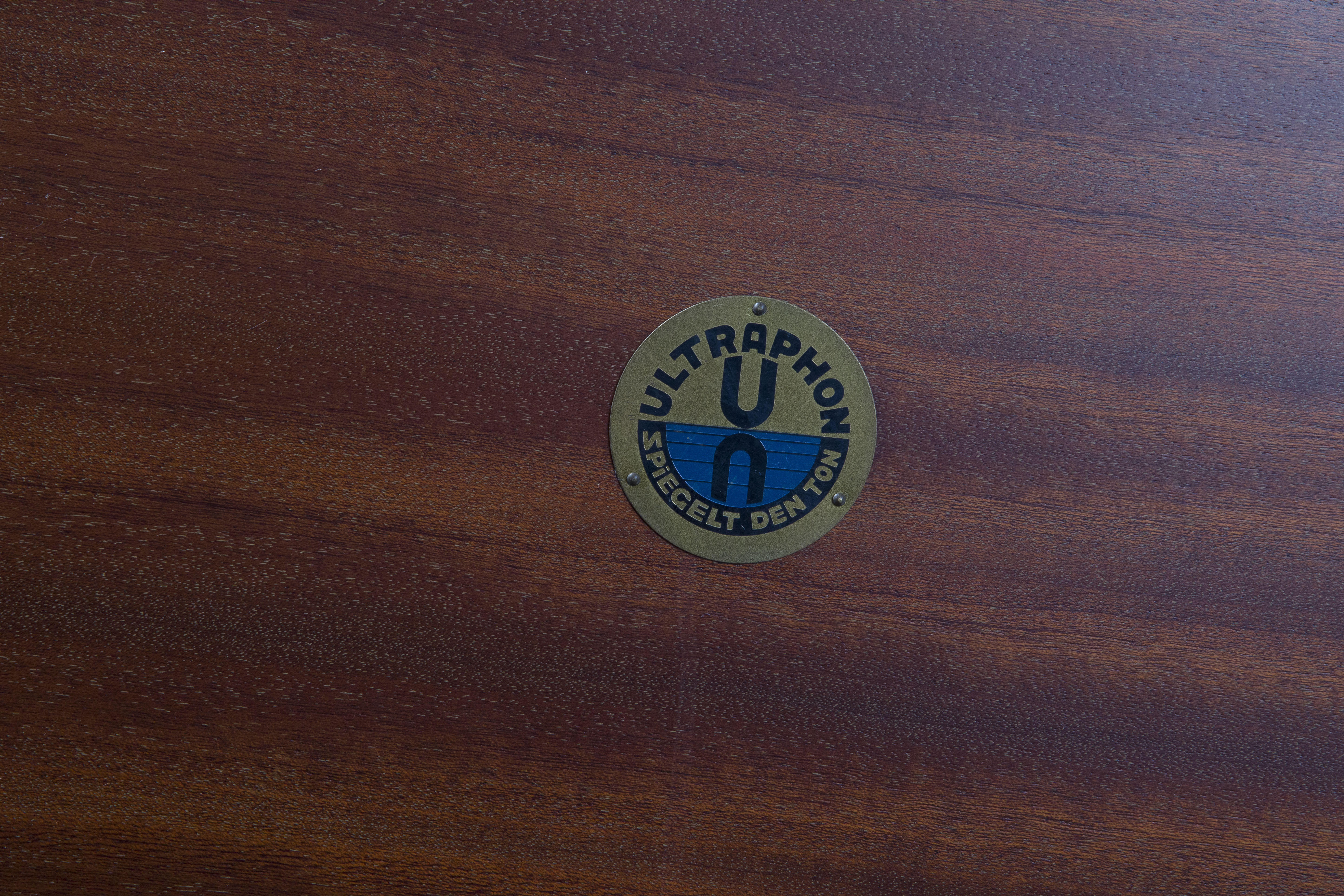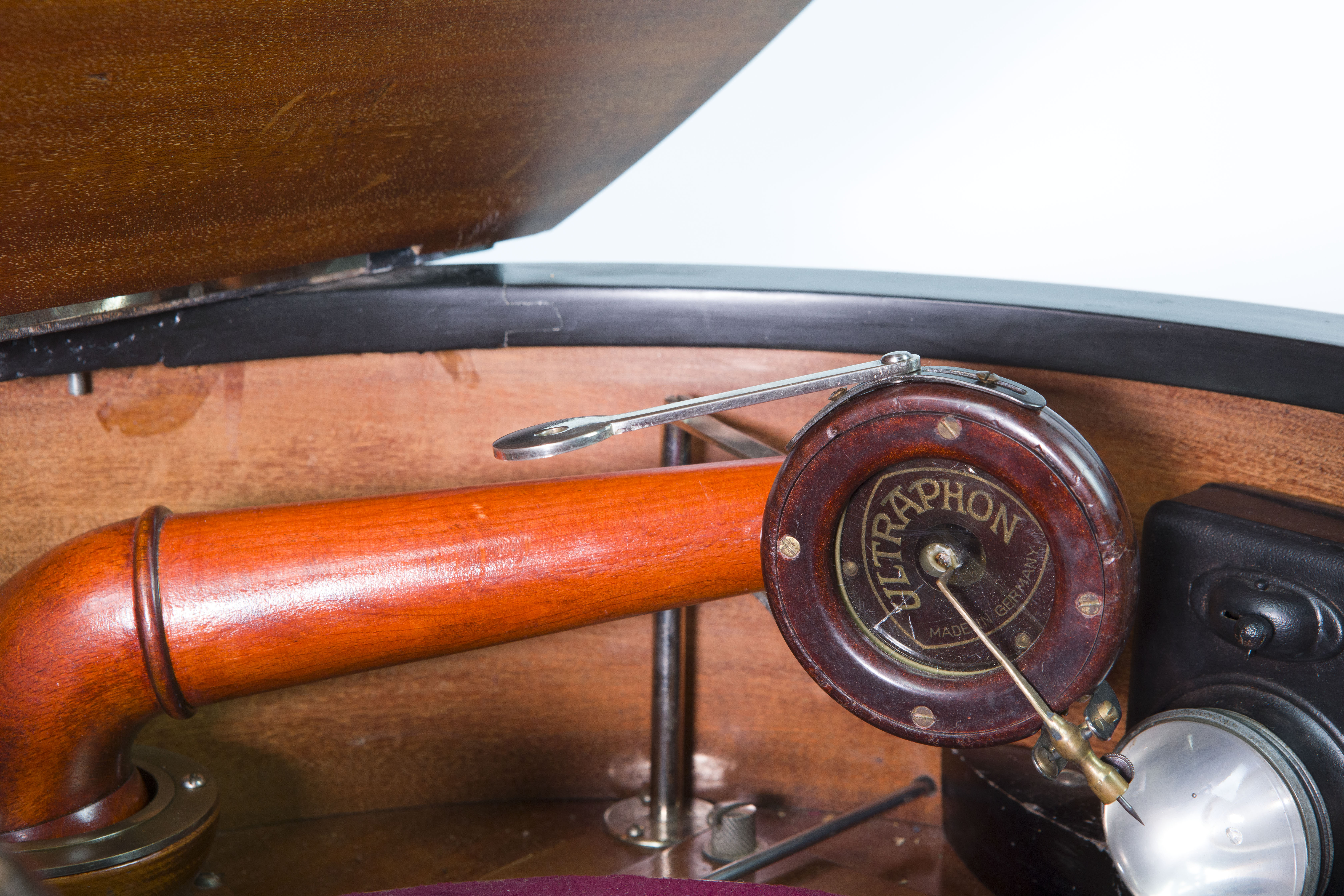 - NOTIZIE STORICO CRITICHE L’industria del suono riprodotto iniziò nel 1877 negli Stati Uniti quando Thomas Edison inventò una maniera di registrare il suono e di riprodurlo tramite una macchina che chiamò fonografo. Nel corso di una decina di anni, questo sistema venne notevolmente migliorato, prima con l’invenzione nel 1886 dei cilindri di cera Bell-Tainter e poi nel 1887 con l’invenzione del disco e l’adozione dell’incisione orizzontale fatta da Emile Berliner che non solo riproduceva il suono con molta più facilità ma rendeva anche la duplicazione molto più agevole. All’invenzione del disco Berliner accompagnò l’invenzione di una macchina per riprodurlo ovvero il grammofono che venne perfezionata nel 1896 da Eldridge R. Johnson con l’aggiunta del motore a molla. La commercializzazione di massa del grammofono divenne sempre più esponenziale proprio grazie alle novità apportate da Johnson e nacquero le prime società interessate a questo tipo di commercio. La società tedesca Deutsche Ultraphon AG venne fondata dall’inventore berlinese Heinrich J. Küchenmeister nel 1925 per la produzione dei grammofoni Ultraphon di sua invenzione di cui il modello presentato in questa scheda è un esempio. I grammofoni Ultraphon riproducono il suono con un effetto stereofonico grazie alla presenza di due casse acustiche interne e a due bracci acustici disposti uno dietro l'altro. Entrambi gli aghi passano ad una distanza fissa attraverso la stessa scanalatura, e questo consente di ottenere uno sfasamento temporale ridotto del segnale audio. In questo modo, da un lato si ottiene un aumento del volume, dall'altro si crea un "suono spaziale" o un effetto pseudo-stereo. Poiché il successo commerciale dell'invenzione era basso, si è presto passati alla costruzione di apparecchiature convenzionali con un solo braccio acustico e, all'inizio del 1929, la Deutsche Ultraphon AG di Berlino si fuse con la filiale olandese con sede ad Amsterdam la Internationale Ultraphoon di Küchenmeister. L'obiettivo era quello di creare una propria produzione di dischi in Germania, i primi dischi furono lanciati nell'autunno del 1929 con nome dell’etichetta “Ultraphon”. Nel luglio 1931, però, la Deutsche Ultraphon AG si trovò in difficoltà nei pagamenti e fu liquidata all'inizio del 1932. Nel marzo 1932 la Telefunken della massa fallimentare acquistò matrici e presse e fondò una propria etichetta come "Telefunkenplatte GmbH"