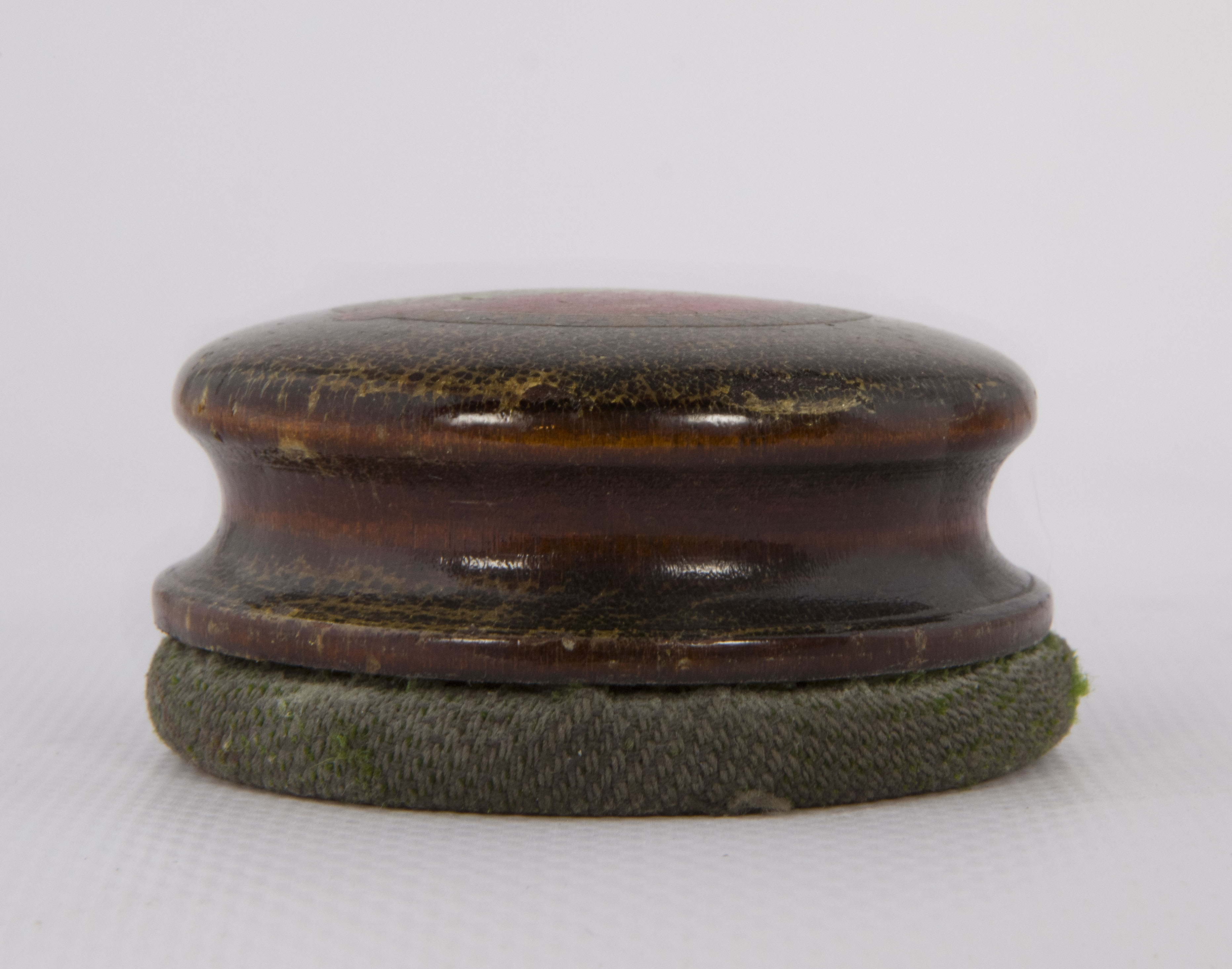 Accessorio impiegato per la pulizia dei dischi da riprodurre con il grammofono. E' realizzato in legno con una forma rotonda ergonomica per permettere una facile presa. La superficie di pulizia è un tampone di velluto di colore verde che consente di pulire delicatamente il disco, riducendo al minimo il rischio di graffi