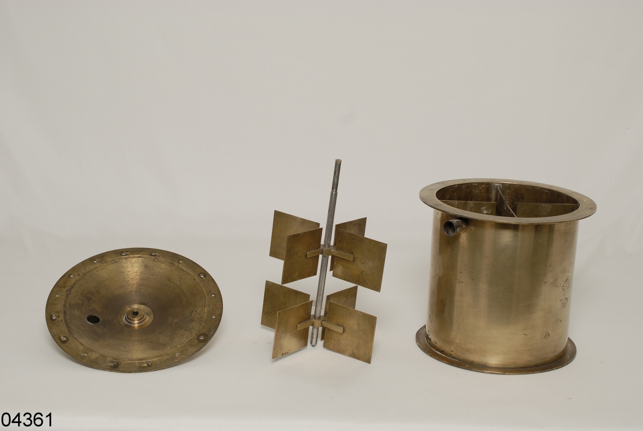 L'apparecchio, interamente realizzato in ottone, è costituito da un recipiente cilindrico verticale, chiuso da un coperchio flangiato fissato mediante viti. Palette orizzontali, saldate alla superficie interna del cilindro, costituiscono la parte fissa del sistema di agitazione dell'acqua. Nella flangia sono presenti due aperture circolari. Quella centrale è chiusa da un cilindretto verticale con cuscinetto a sfere nel quale è inserito l'albero, munito di palette orizzontali (parte mobile dell'agitatore), che può essere posto in rotazione con un meccanismo esterno (mancante). La parte fissa e la parte mobile dell'agitatore impediscono all'acqua di assumere un movimento di rotazione e producono un forte attrito tra palette ed acqua. Nel foro decentrato viene inserito un termometro (mancante) per la misura della temperatura del liquido. L'apparecchio può essere utilizzato per ripetere l'esperimento con cui Joule nel 1847 determinò l’equivalente meccanico del calore J