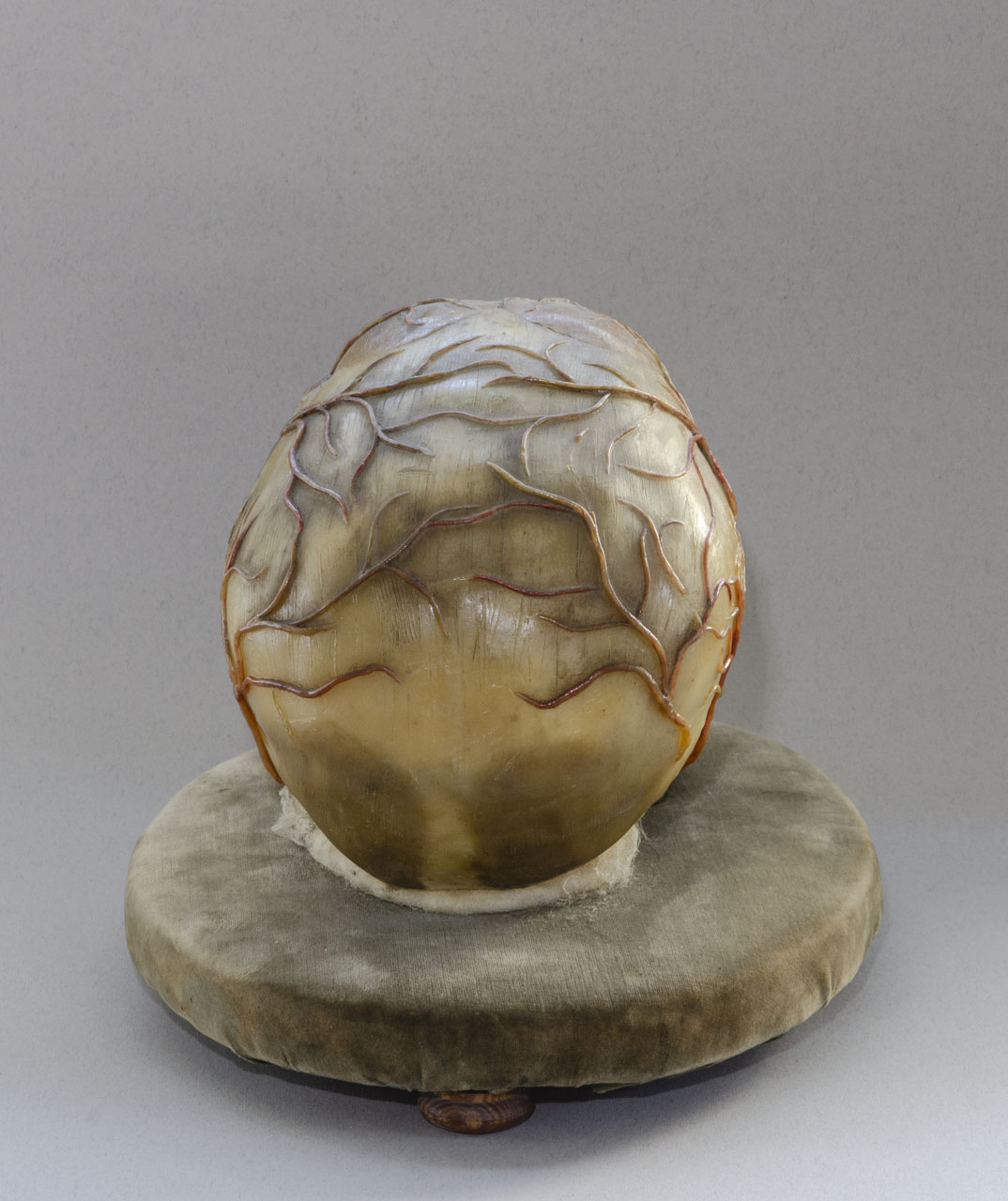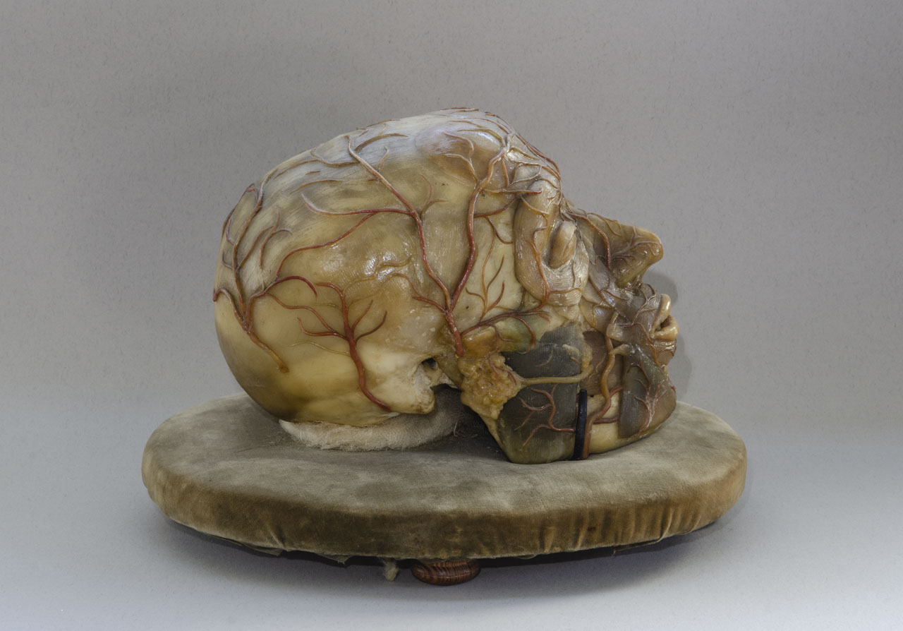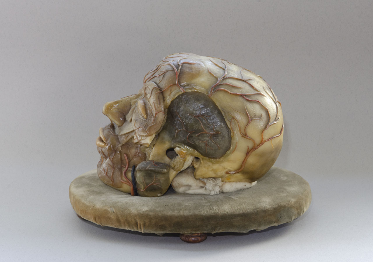 Manufatto in cera su base in legno foderata di velluto chiaro che evidenzia la rete vascolare nell'estensione del territorio craniale