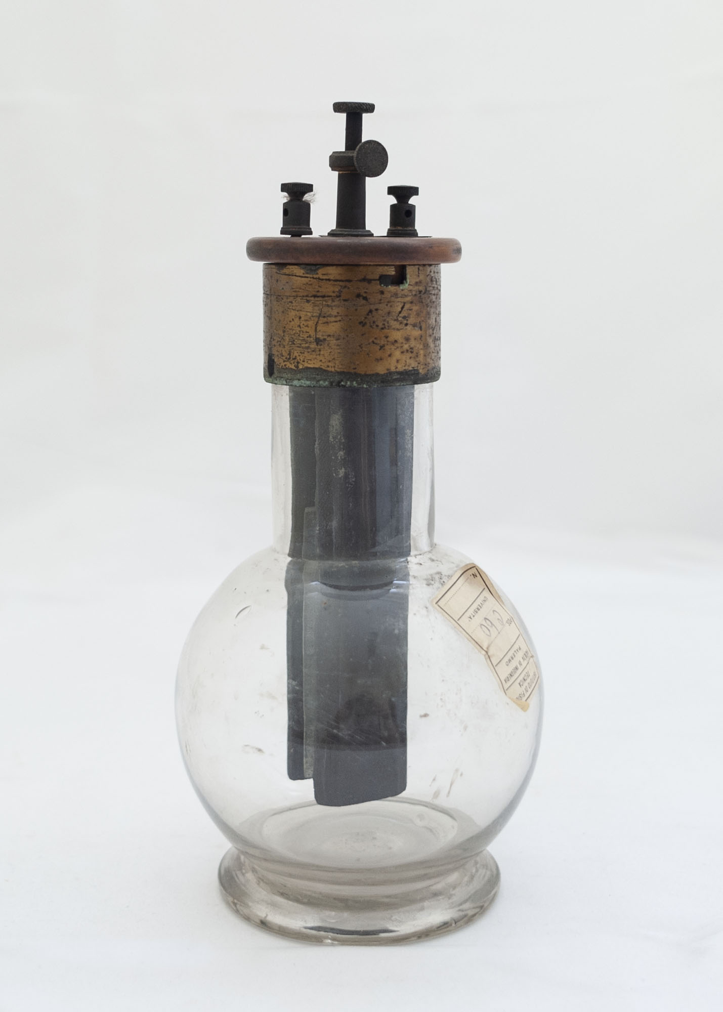 la pila Grenet è costituita da un recipiente in vetro a forma di bottiglia sferica a collo alto e largo, riempita per circa a metà della sua capienza con una soluzione elettrolitica (mancante) composta da bicromato di potassio, acido solforico e acqua. Il recipiente in vetro è chiuso da un coperchio di ebanite a cui sono fissate due barrette di carbone. Una lamina di zinco è sostenuta da un'asta di ottone che scorre verticalmente in un piccolo tubo metallico posto al centro del coperchio. Immergendo o sospendendo fuori dal liquido la barretta di zinco, che è lunga meno della metà delle barrette di carbone, si attiva o si interrompe l'azione della pila. Una vite nel tubetto può bloccare l'asta nella posizione opportuna. Sopra il coperchio sono fissati due serrafili con foro passante e vite, per inserire il circuito esterno, collegati rispettivamente alla barretta di zinco e a quelle di carbone