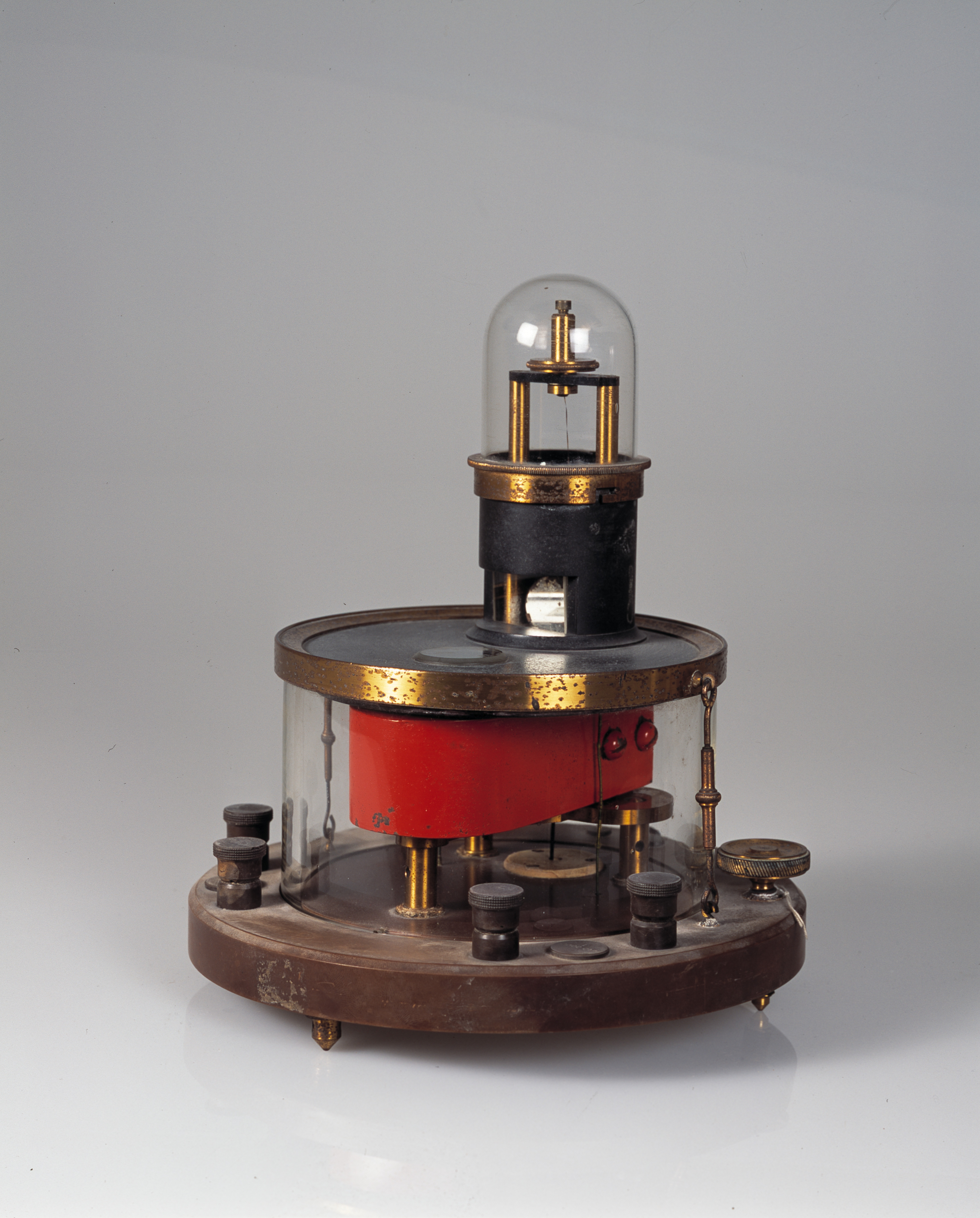 I galvanometri sono strumenti che permettono di misurare una corrente attraverso i suoi effetti elettromagnetici, i quali determinano il moto relativo tra un magnete ed un rocchetto. Quando è il rocchetto ad essere mobile, il galvanometro viene detto magneto-elettrico o a moltiplicatore mobile. In questa categoria il più diffuso fu sicuramente quello ideato nel 1881 da D'Arsonval, che aveva modificato uno strumento dovuto a Deprez. Il galvanometro in esame è a specchio con bobina mobile, ed è probabile fosse stato creato per scopi puramente didattici, visto che è in gran parte trasparente e visibile al suo interno. Lo strumento di misura è costituito da un filo di torsione sospeso verticalmente con uno specchio. Verso il basso, il filo è piegato in una bobina. Il filo termina in una molla per garantire che il filo non possa girare troppo lontano. La bobina è posta tra i poli di un magnete permanente. Un campo magnetico viene creato quando la corrente scorre attraverso la bobina. L'interazione del campo magnetico con il magnete permanente fa sì che la bobina ruoti leggermente attorno all'asse verticale. Lo specchio si muove con esso, che altera il percorso di un raggio di luce, indicando la forza della corrente elettrica. Il filo di torsione è fissato alla sommità del cilindro di vetro superiore. Lo specchio si trova nella parte inferiore di questo cilindro. Il cilindro inferiore contiene anche il magnete permanente con la bobina. Sulla base sono presenti i morsetti di collegamento per i cavi di alimentazione e le viti di regolazione per livellare l'apparecchio. Una livella a bolla si trova davanti al cilindro superiore