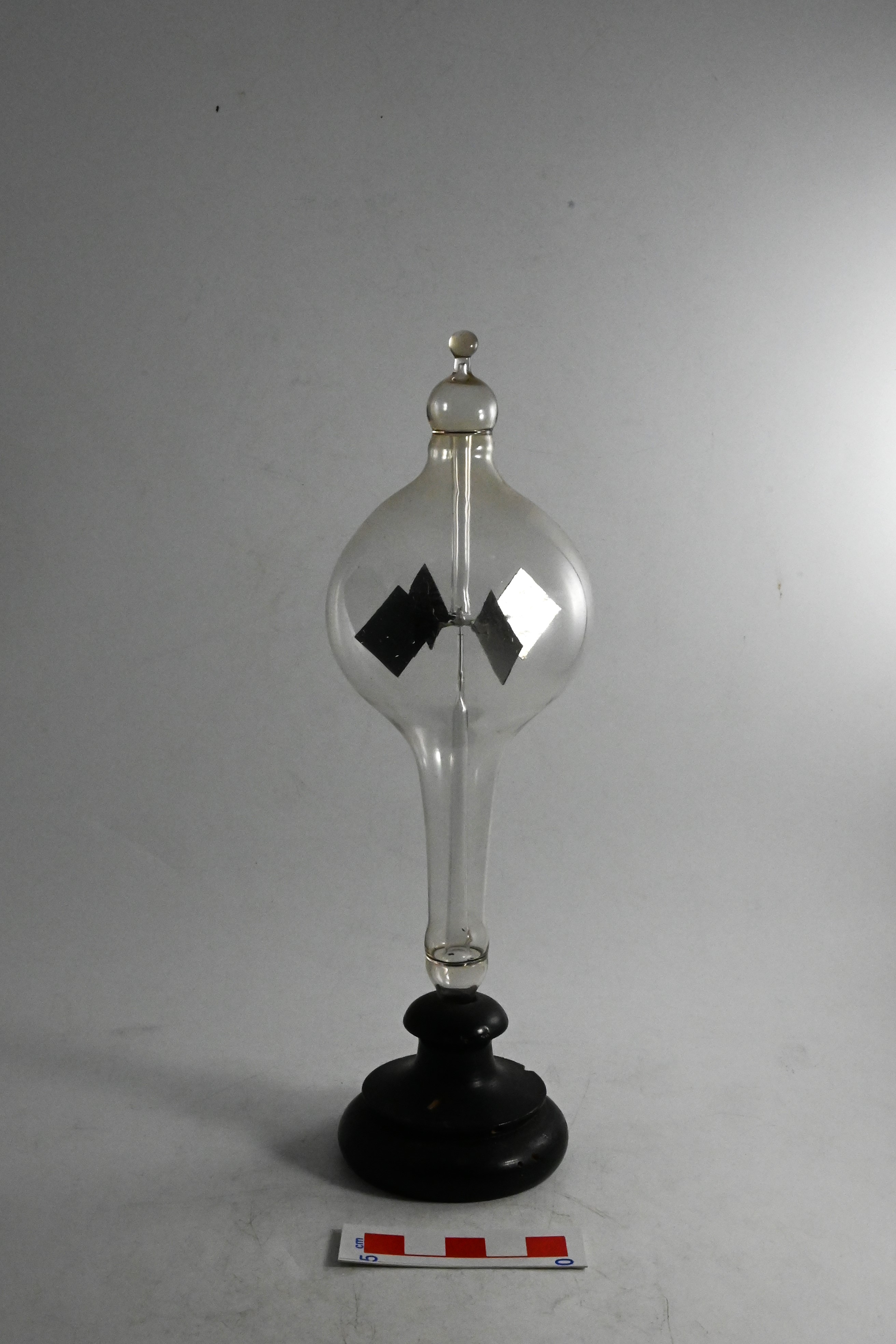Il radiometro di Crookes è un semplice dispositivo, inventato da Crookes nel 1873, che all'inizio si pensava servisse a misurare la pressione di radiazione della luce, mentre in realtà misura la radiazione elettromagnetica. Su una base lignea si innesta un bulbo di vetro, al cui interno viene creato parzialmente del vuoto; vi si trovano quattro palette rotanti, di metallo leggero, poste su un supporto verticale. Ogni paletta ha una faccia annerita e una chiara. Se esposte alla luce le palette cominciano a ruotare senza nessun apparente motore che le spinga. L'esemplare rinvenuto non presenta numeri di inventario o marchi di riferimento, e si trova in buone condizioni di funzionamento