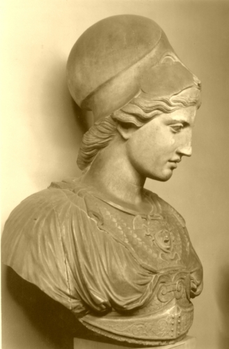 La testa è caratterizzata un ovale pieno e morbido levemente inclinato verso sinistra. La fronte è ampia, le arcate soppraccigliari poco profonde ombreggiano appena lo sguardo mesto e riflessivo. L'acconciatura è costituita da ciocche, separate sulla fronte e raccolte sulla nuca.Il capo è coperto in gran parte dall'elmo corinzio.