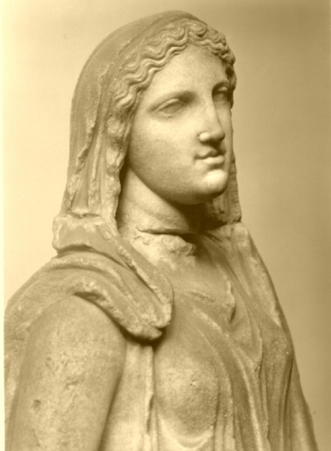 La figura femminile è stante, con peplo e mantello caratterizzati dalle fitte e mosse increspature del panneggio. La testa è inclinata e coperta da un lembo estremo del peplos; i capelli sono resi a ciocche ben segnate e ondulate. Mancano i due avambracci. Il retro è lavorato sommariamente.