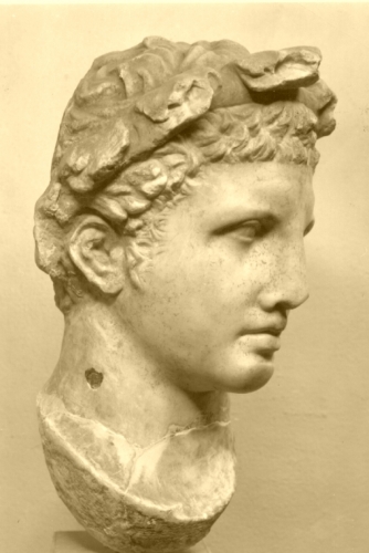 La testa ritrae un giovane dal volto dall'ovale pieno, caratterizzato da grandi occhi, naso diritto e labbra carnose appena socchiuse. L'acconciatura è costituita da capelli tagliati corti sul capo. In testa porta una corona di foglie.