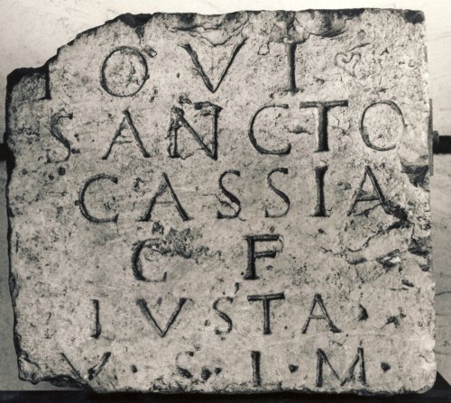 - ISCRIZIONI fronte - Iovi / Sancto / Cassia / C(ai) f(ilia) / Iusta. / V(otum) s(olvit) l(ibens) m(erito). - Lettere posate maiuscole - Incisione - latino