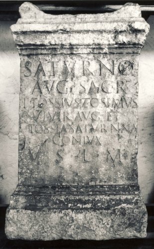 - ISCRIZIONI fronte - Saturno / Aug(usto) sacr(um) / P(ublius) Tossius Zosimus / VIvir Aug(ustalis) et / Tossia Saturnina / coniux / v(otum) s(olverunt) l(ibentes) m(erito). - Lettere posate maiuscole - Incisione - latino