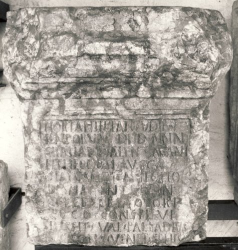 - ISCRIZIONI fronte - Hortante beati[t]udini / temporum d(ominorum) n(ostrorum) / Gratian[i, V]alentiniani / et Theodosi Aug(ustorum), / statuam in [C]apitolio / Div(is) iacentem, in / cereberrimo (!) fori / loco constitui / iussit Val(erius) Palladius / v(ir) c(larissimus) cons(ularis) Venet(iae) et Hist(riae) / ------. - Lettere posate maiuscole - Incisione - latino