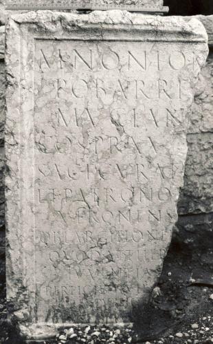 - ISCRIZIONI fronte - M(arco) Nonio M(arci) [f(ilio)] / Pob(lilia) Arrio / Mucian[o] / co(n)s(uli), pr(aetori), XV[vir(o)] / sac(ris) f(aciundis), curat[ori] / et patrono [r(ei) p(ublicae)] / Veronens[ium]; / ob largitione[m---] / quod at (!) ther[mas] / Iuventia[---] / perficiend(as) HS [---] / rei public(ae) d[edit] / ordo [---]. - Lettere posate maiuscole - Incisione - latino