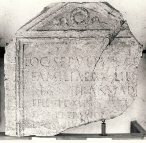 - ISCRIZIONI fronte - Loc(us) sepulturae / familiae XX lib(ertatis) / reg(ionis) Transpad(anae). / Theopompus ark(arius) / d(edit) s(ua) p(ecunia) et Tryphoniu[s] / et Q(uintus) Sicin[ius] / ------. - Lettere posate maiuscole - Incisione - latino
