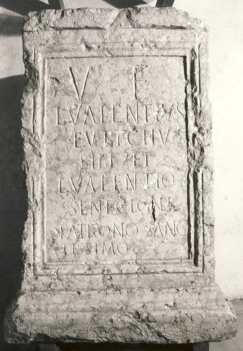 - ISCRIZIONI fronte - V(ivus) f(ecit) / L(ucius) Valentius / Eutychus / sibi et / L(ucio) Valentio / Senecioni / patrono /sanc/tissimo. - Lettere posate maiuscole - Incisione - latino