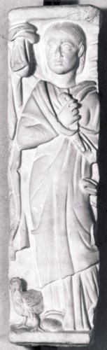 - NOTIZIE STORICO CRITICHE Il frammento appartiene ad un sarcofago del quale potrebbe costituire un angolo od una porzione del centro. La donna porta una acconciatura documentata nell'iconografia dal terzo secolo d.C. all'età tetrarchica (Fittschen-Zanker). Una figura femminile molto simile è stata osservata in un sarcofago di Roma datato al primo quarto del quarto secolo d.C.