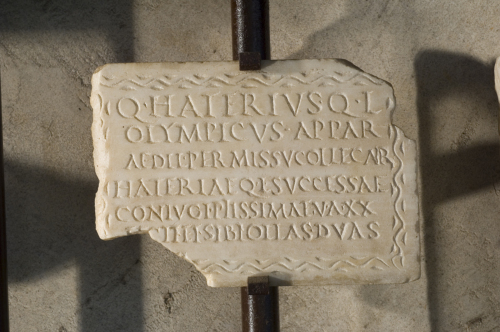 - ISCRIZIONI fronte - Q(uintus) Haterius, Q(uinti) l(ibertus), / Olympicus, appar(itor) / aedil(ium), permissu collecar(um) / Hateriae, Q(uinti) l(ibertae), Successae, / coniugi piissimae, v(ixit) a(nnos) XX / fecit et sibi ollas duas. - lettere maiuscole posate tendenti alla scrittura attuaria - Incisione - latino