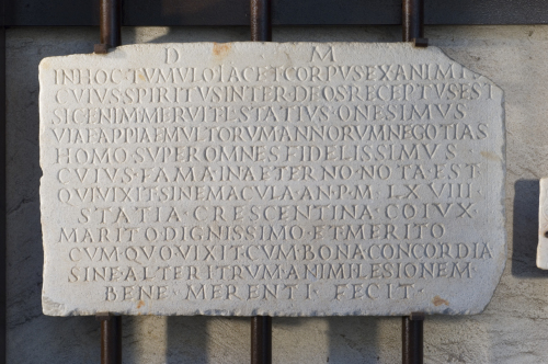 - ISCRIZIONI fronte - D(is) M(anibus). / In hoc tumulo iacet corpus exanimis / cuius spiritus inter deos receptus est / sic enim meruit L(ucius) Statius Onesimus / viae Appiae multorum annorum negotia(n)s / homo super omnes fidelissimus / cuius fama in aeterno nota est / qui vixit sine macula an(nos) p(lus) m(inus) LXVIII / Statia Crescentina co(n)iux / marito dignissimo et merito / cum quo vixit, cum bona concordia, / sine alteritrum animi l(a)esionem / bene merenti fecit. - lettere posate maiuscole tendenti alla scrittura attuaria - Incisione - latino