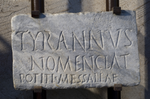 - ISCRIZIONI fronte - Tyrannus, / nomenclat(or) / Potiti Messallae. - lettere posate maiuscole tendenti alla scrittura attuaria - Incisione - latino