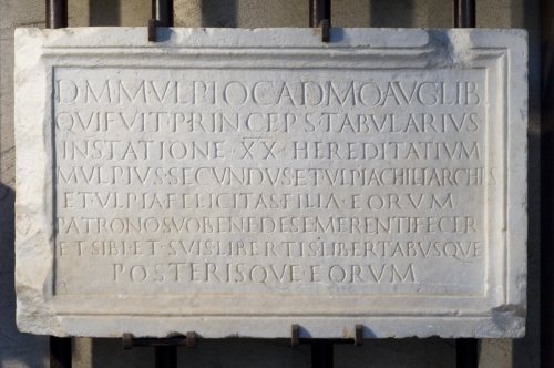 - ISCRIZIONI fronte - D(is) M(anibus). M(arco) Ulpio Cadmo, Aug(usti) lib(erto), / qui fuit princeps tabularius / in statione XX hereditatium. / M(arcus) Ulpius Secundus et Ulpia Chiliarchis / et Ulpia Felicitas, filia eorum, / patrono suo, de se bene merenti fecer(unt) / et sibi et suis libertis libertabusque / posterisque eorum. - lettere posate maiuscole, con apicature. - Incisione - latino