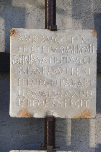 - ISCRIZIONI fronte - Aur(elius), Augg(ustorum) lib(ertus), / Epictetus, Val(e)r(iae) Capi/tolin(a)e, matri dulci/ssim(a)e mulieri / et inconparabi/li, quae vix(it) ann(os) / LX, bene m(erenti) fecit. - lettere posate maiuscole tendenti alla scrittura attuaria - Incisione - latino