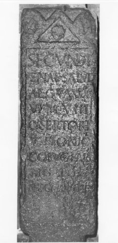 - ISCRIZIONI fronte - Secundie/ae Salvi/ae, q(uae) v(ixit) a(nnos) XXX/VI, m(enses) VIII, / Q(uintos) Sertori/us Leonic(us) / co(n)iugi Kar(issimae) / mer(enti) pos(uit). / N(umeros) CCC XVIIII - Lettere posate maiuscole - a solco - latino
