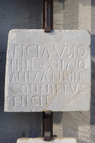 - ISCRIZIONI fronte - Ti(berio) Claudio / Philoxeno. / Alexander, / colibertus, / fecit. - Lettere posate maiuscole - Incisione - latino