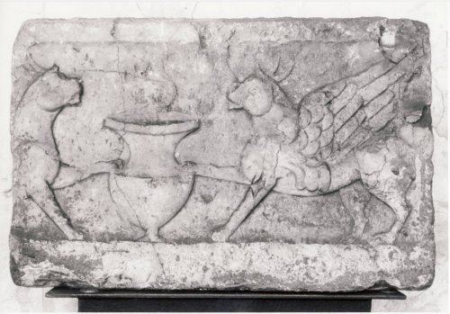 - NOTIZIE STORICO CRITICHE Il rilievo, per motivi stilistici, può essere datato intorno al II secolo d.C. Il soggetto è molto diffuso soprattutto nei rilievi di destinazione funeraria. Infatti i grifi, compagni di Apollo, simboleggiano la luce e l'eternità.