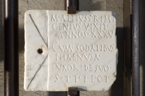 - ISCRIZIONI fronte - M(arcus) Attius Primi/genius vixit / annos XXXV. / Cum sodalibus / Phaenusa, / uxor, de suo. / S(it) t(ibi) t(erra) l(evis). E(ras) c(arus) t(uis). - lettere posate maiuscole tendenti alla scrittura attuaria - Incisione - latino