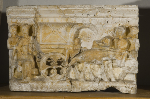 Cassa parallelepipeda apoda; cornice composta da listello, fascia, toro, dentelli e perline; zoccolo a fascia delimitata da listelli. Sulla fronte carpento con defunto recumbente sporgente con il busto, trainato da una coppia di muli; il telone del carro ha orli frangiati e fasce incidenti con rosetta centrale; a sinistra tre figure, una di dimensioni minori; a destra tre figure, una di dimensioni minori.